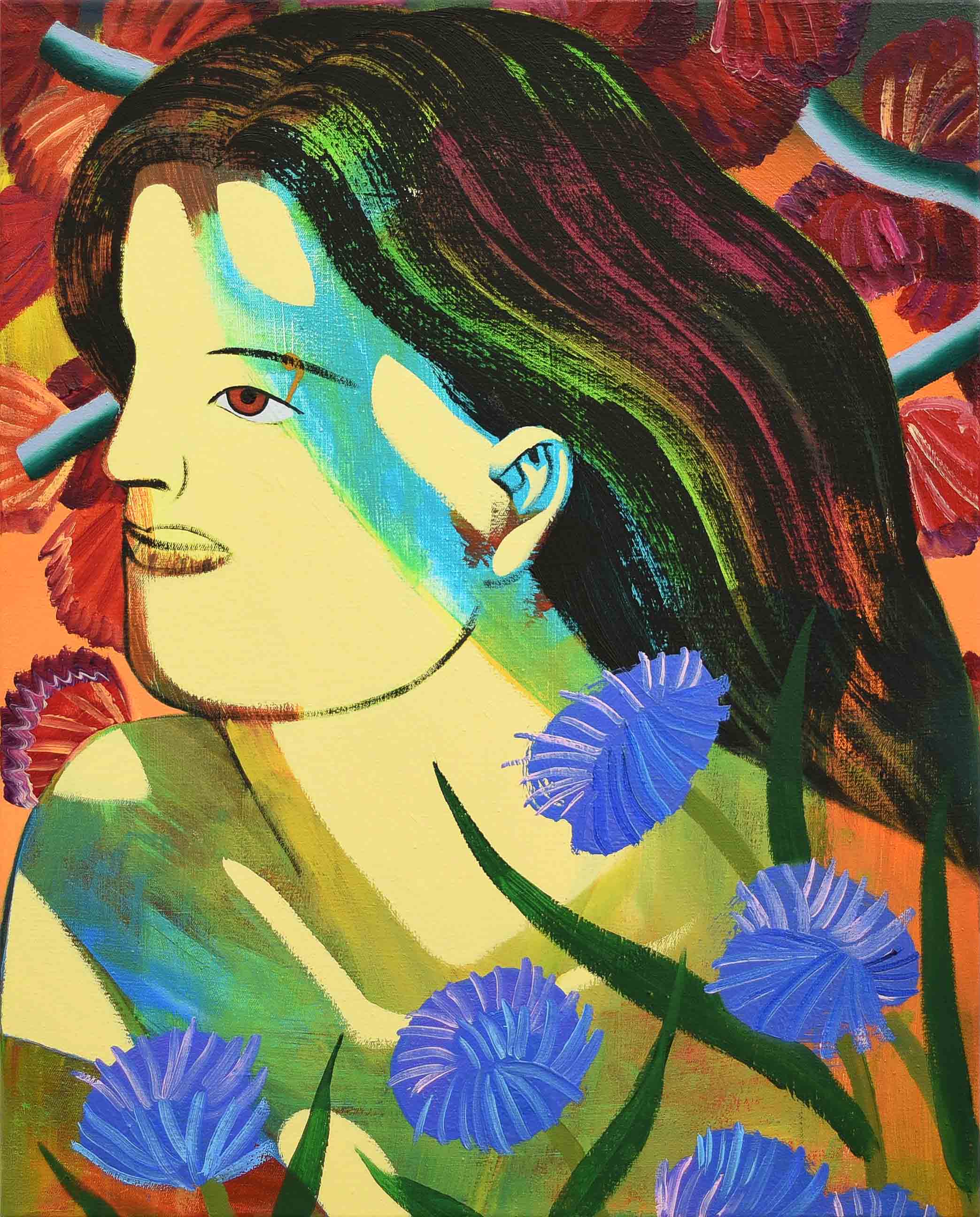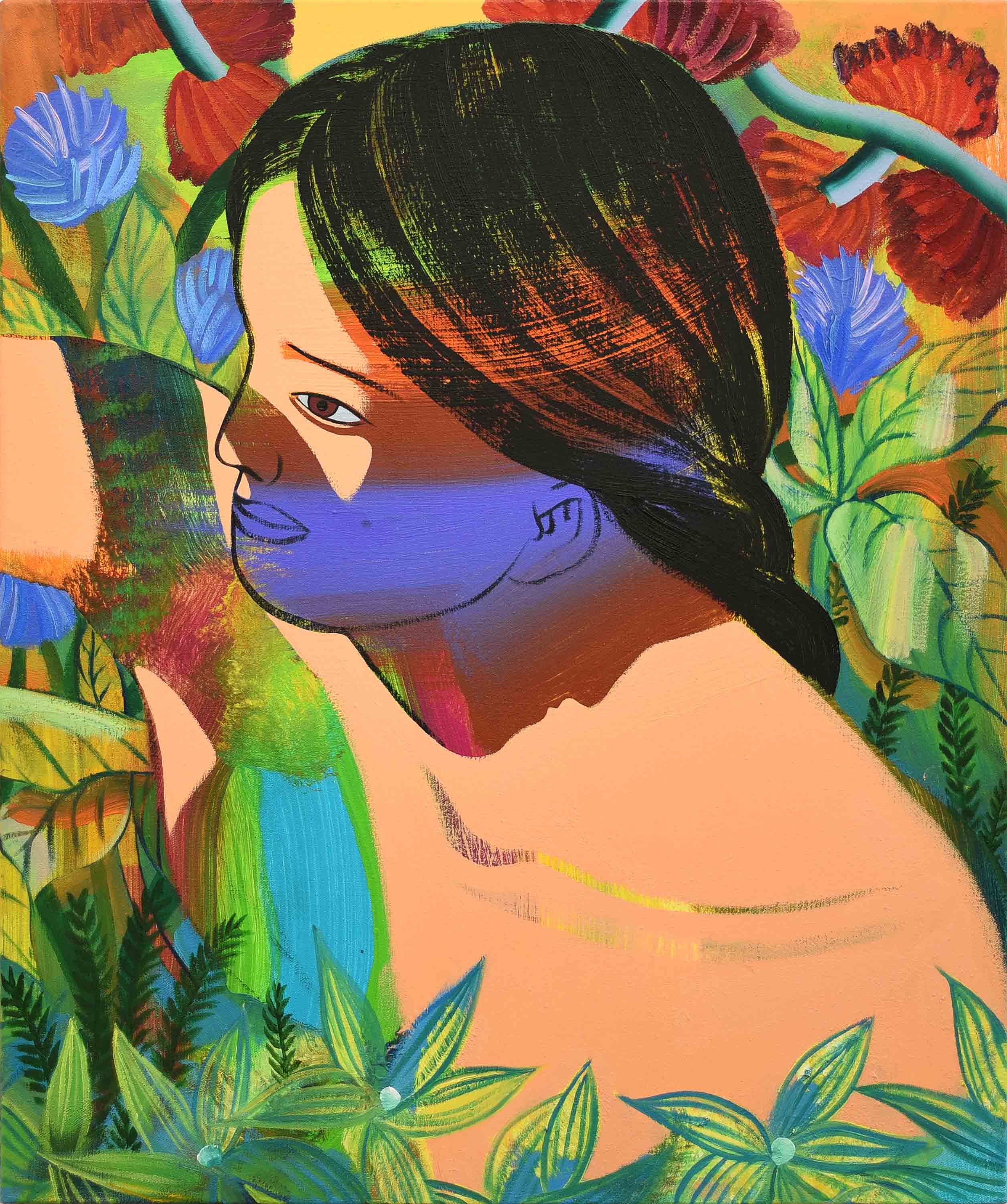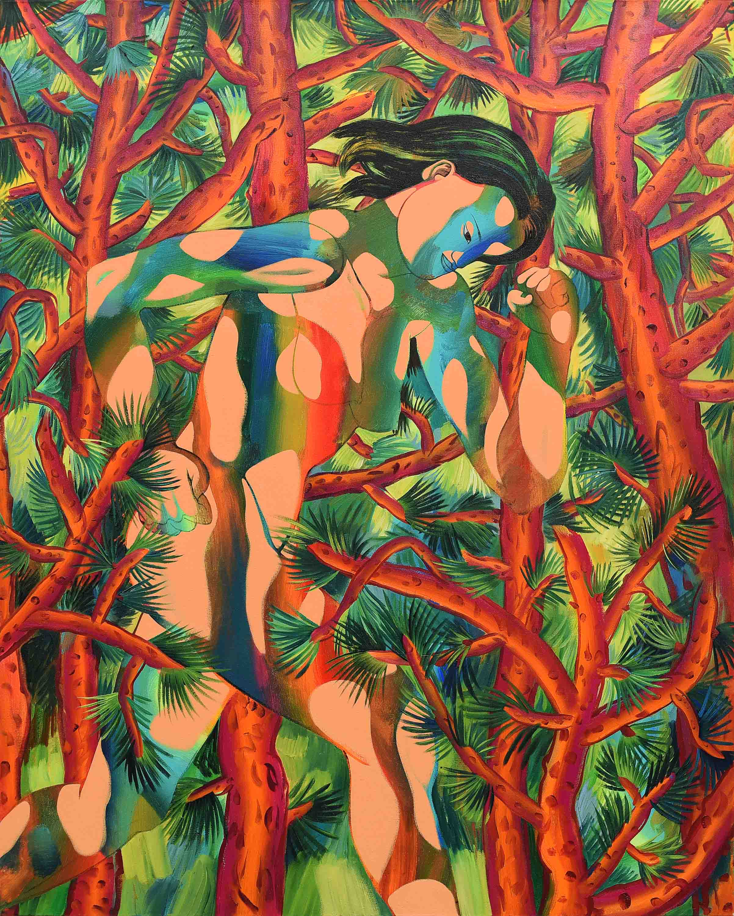 In the ceaseless time of looking at Kim’s oeuvre, it is hard to escape from her figurative yet abstractly gazing human beings. In order to emancipate herself from the historical discourse of figurative expressionism, Kim’s artistic language has developed from the visual imagination of abstract figures. It combines figurative realisation of uncovered yet demonstrative bodies with abstractly sketched components from her understanding of human beings with unfinished narratives. Her appreciation of human beings forms its own artistic semiotics, such as the combination of human bodies with natural patterns or fragments from the abstract backgrounds of each painting.