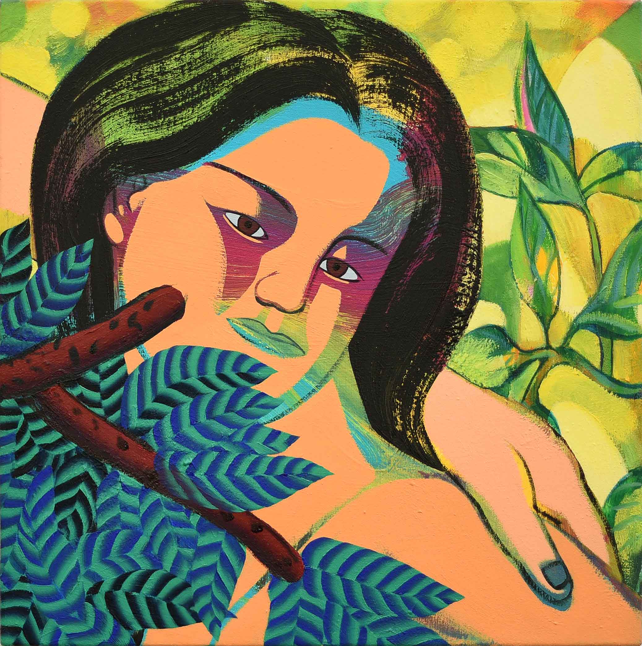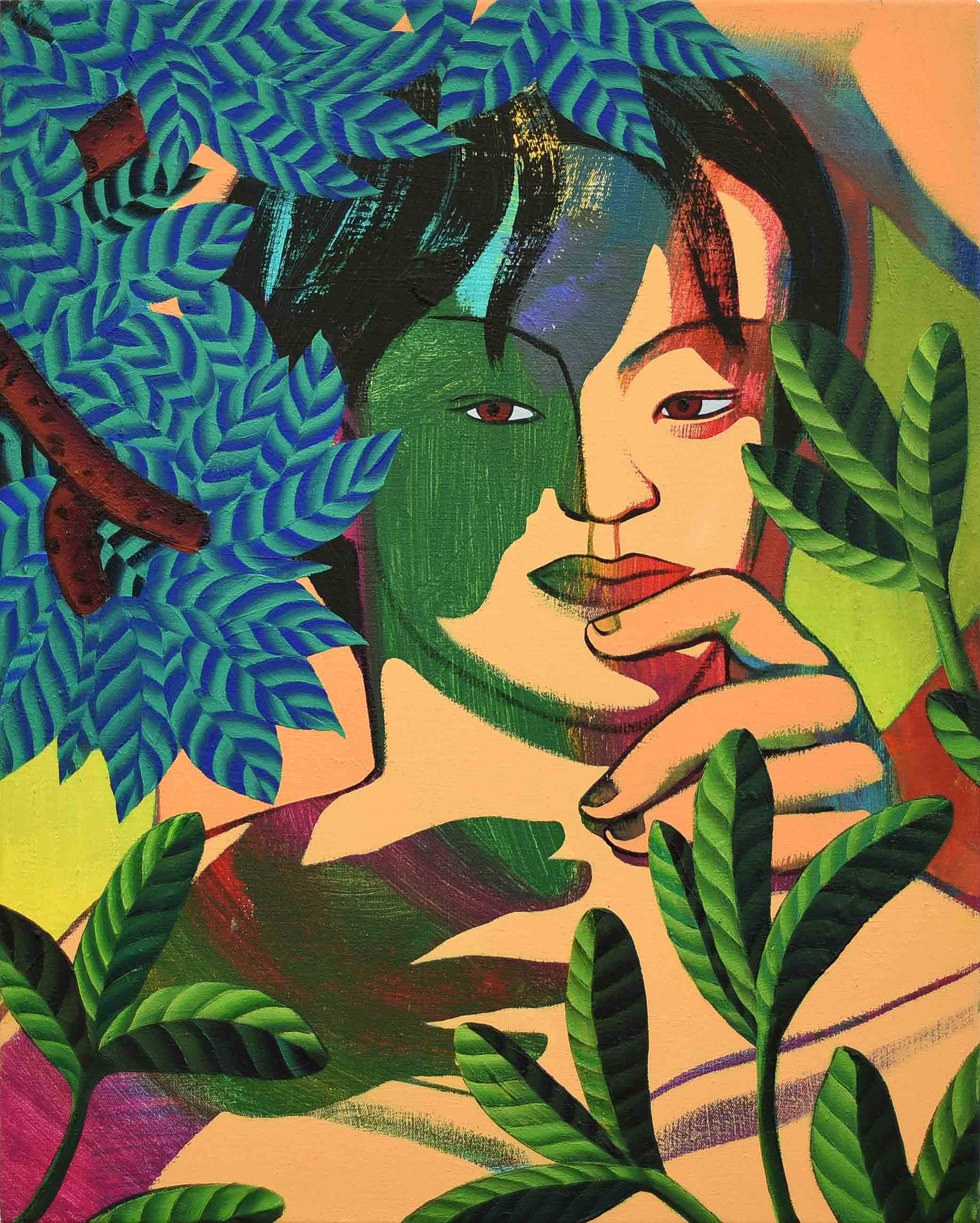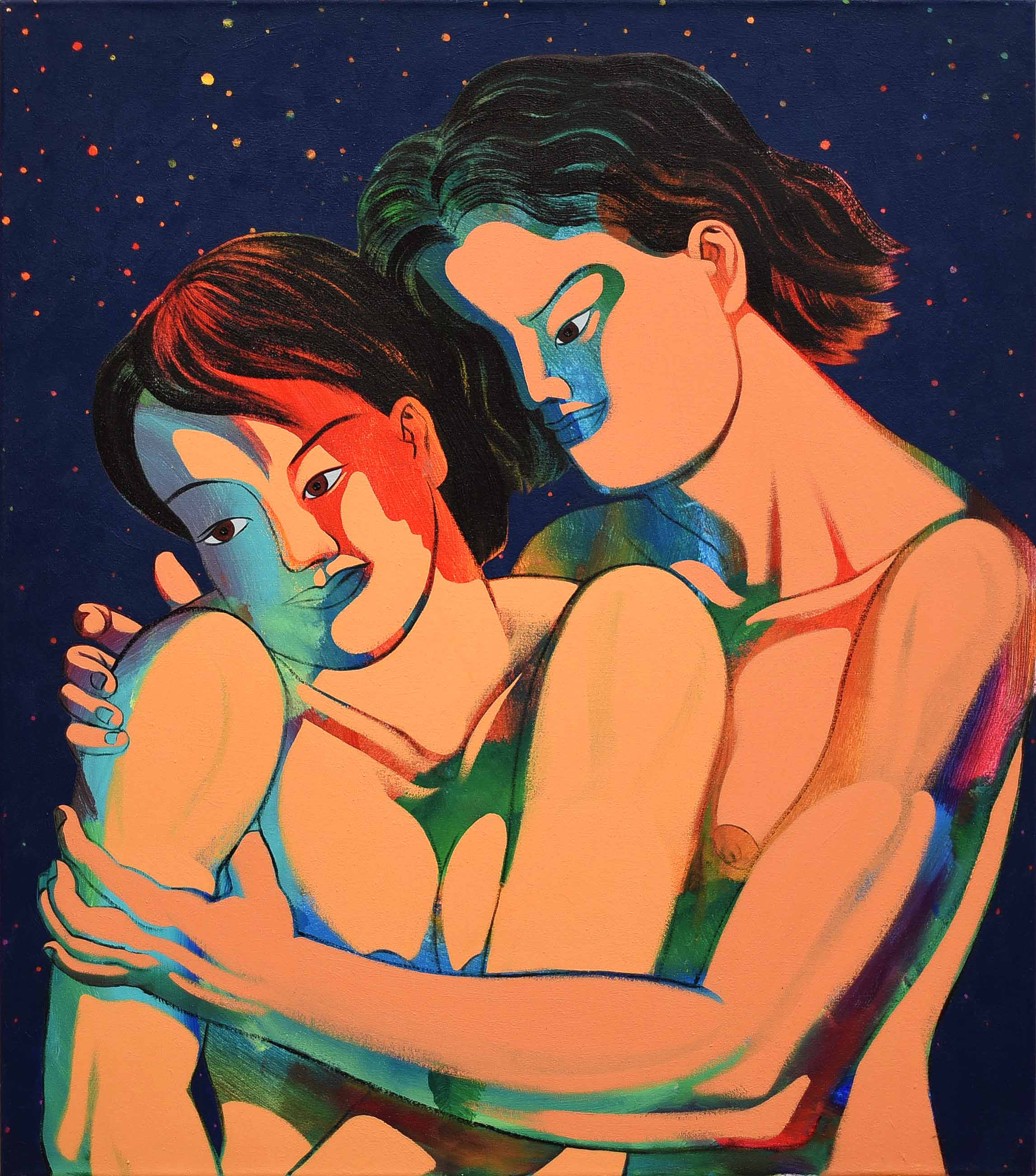 In the ceaseless time of looking at Kim’s oeuvre, it is hard to escape from her figurative yet abstractly gazing human beings. In order to emancipate herself from the historical discourse of figurative expressionism, Kim’s artistic language has developed from the visual imagination of abstract figures. It combines figurative realisation of uncovered yet demonstrative bodies with abstractly sketched components from her understanding of human beings with unfinished narratives. Her appreciation of human beings forms its own artistic semiotics, such as the combination of human bodies with natural patterns or fragments from the abstract backgrounds of each painting.