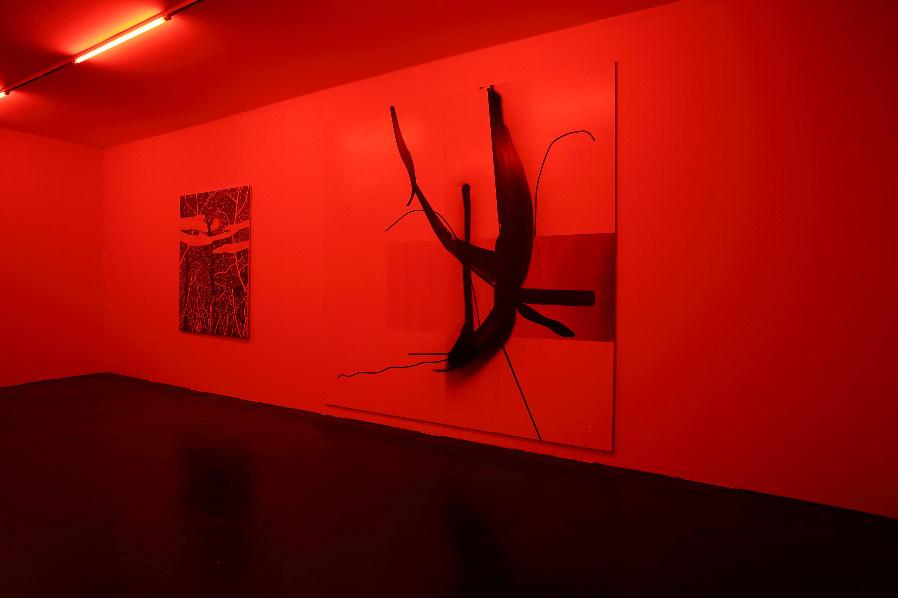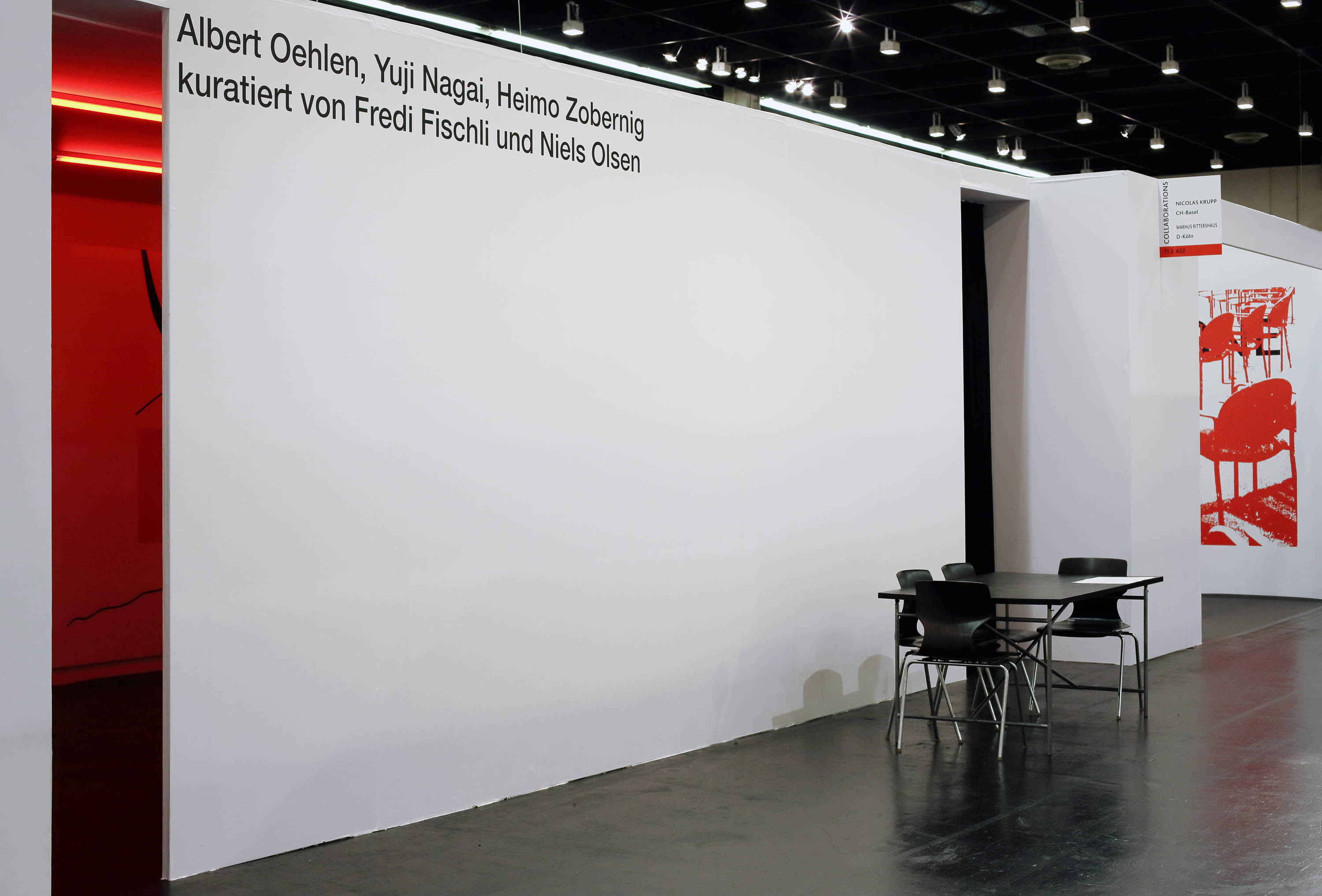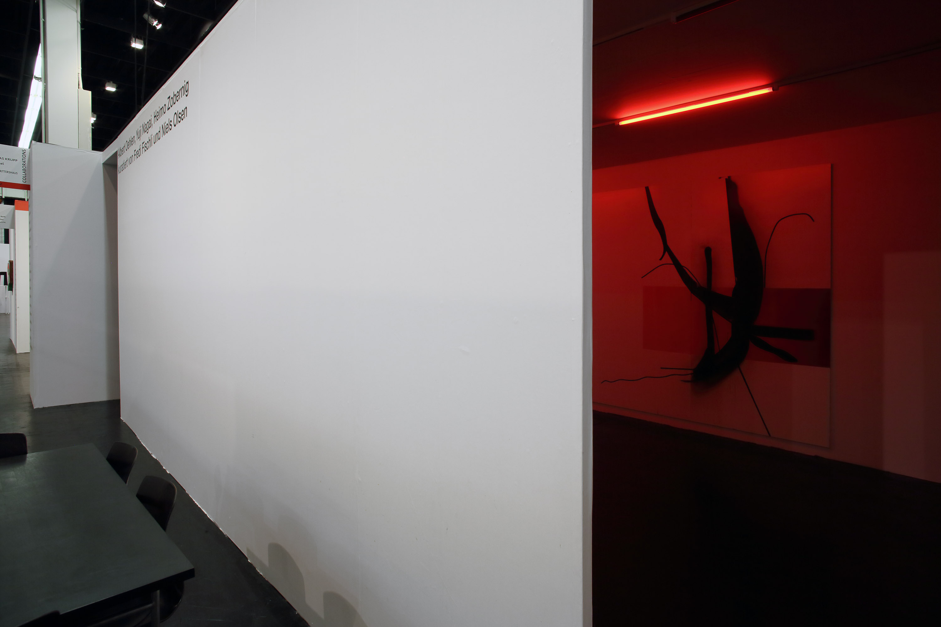 The work Untitled (in Red) (2016) by Heimo Zobernig deals with the question of display, or, more specifically, how an exhibition display may interact with the works it encloses, presents, enhances. At Art Cologne in 2016, Untitled (in Red) served as a somewhat dysfunctional display for two paintings by Albert Oehlen and Yuji Nagai: consisting of several red neon tubes that bathe the whole room as well as the works by Oehlen and Nagai in red light, it inevitably altered the visual quality of the paintings. Color nuances were erased and could only be perceived as chiaroscuro contrasts. At the same time, both works became readable through the same filter, became comparable on a level other than the motivic (both paintings show vegetative forms, trees). Furthermore, the atmosphere of the white-cube booth that is typically used as an exhibition display at art fairs was radically changed. The viewer was herself immersed in the red light and thus became aware of her own presence and relativity of appearance. The red color also transported another layer of meaning, as it recalled spaces with an ambiance of murkiness, ambivalence—"political red-light zones," as Zobernig puts it, and "Moulin Rouge" interiors. Zobernig worked with this strategy in a number of other shows: at Kunsthalle Wien in 1994, for example, his installation also entered into a dialogue with paintings by Albert Oehlen—a dialogue that would be resumed several times in various contexts. At Kunsthalle Zürich in 2011, which was at the time exhibiting in the Baroque rooms of the Museum Bärengasse, Untitled (in Red) was the title of Zobernig's solo show, in which the notion of color within architecture and exhibition display was even more rigorously highlighted.