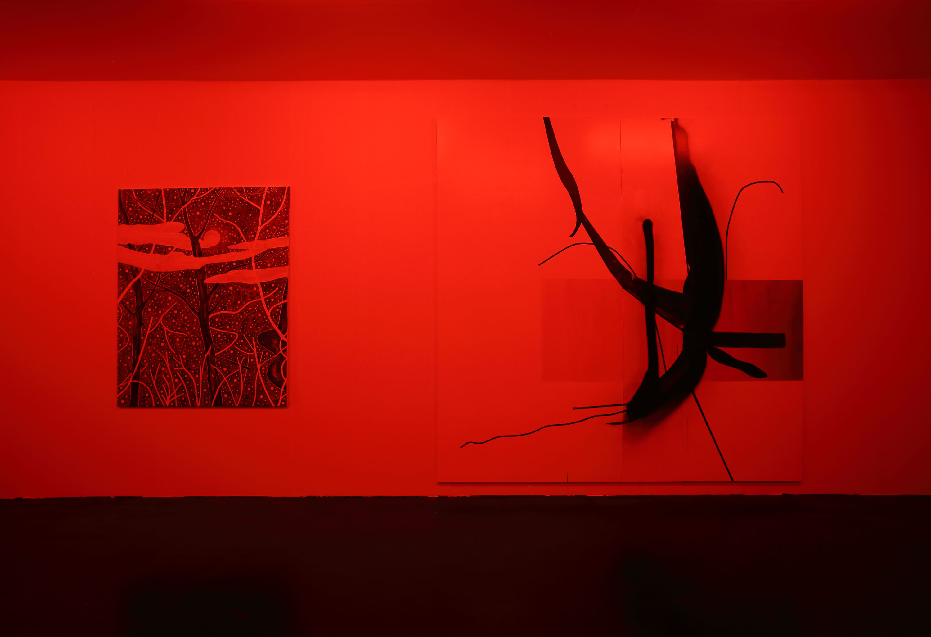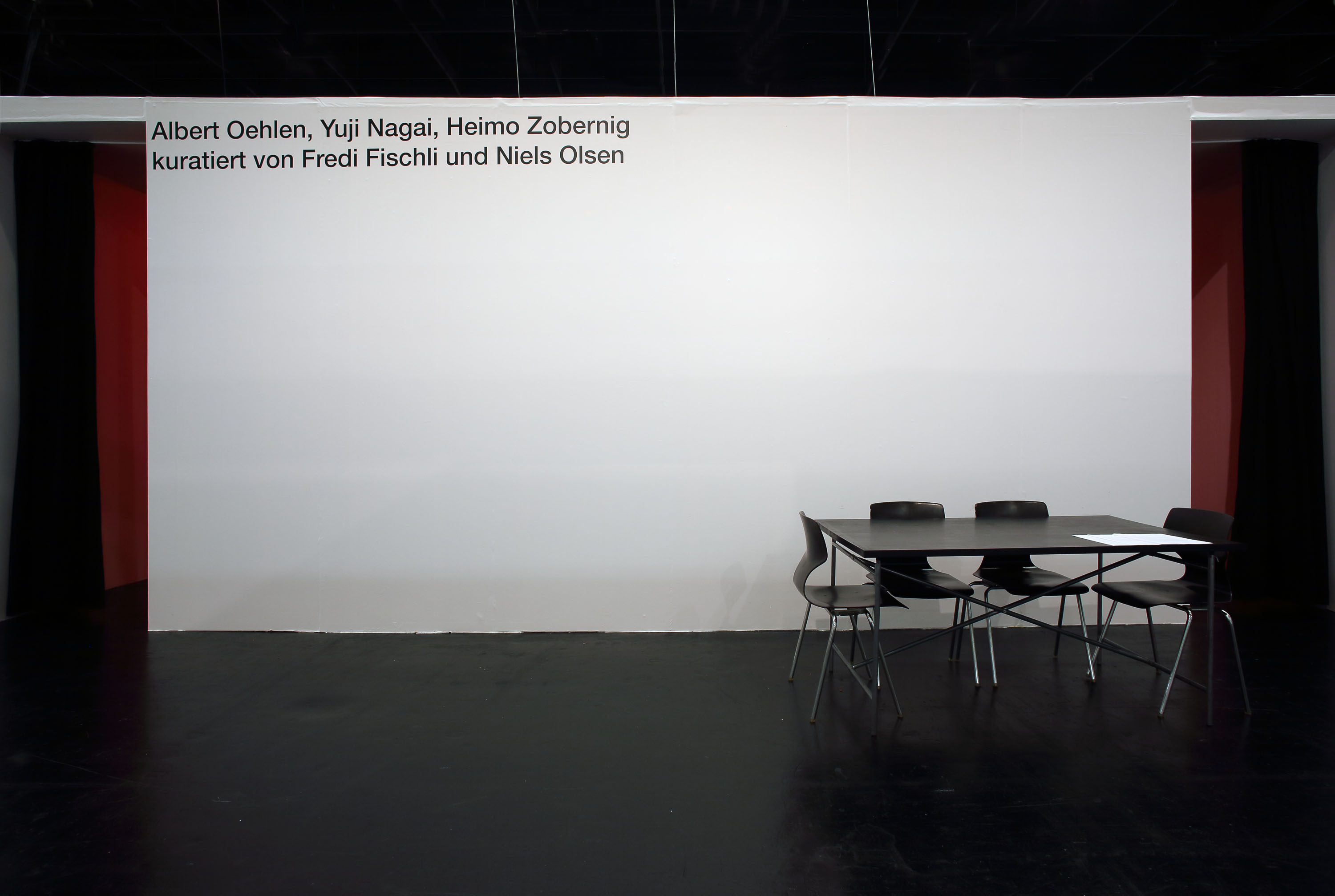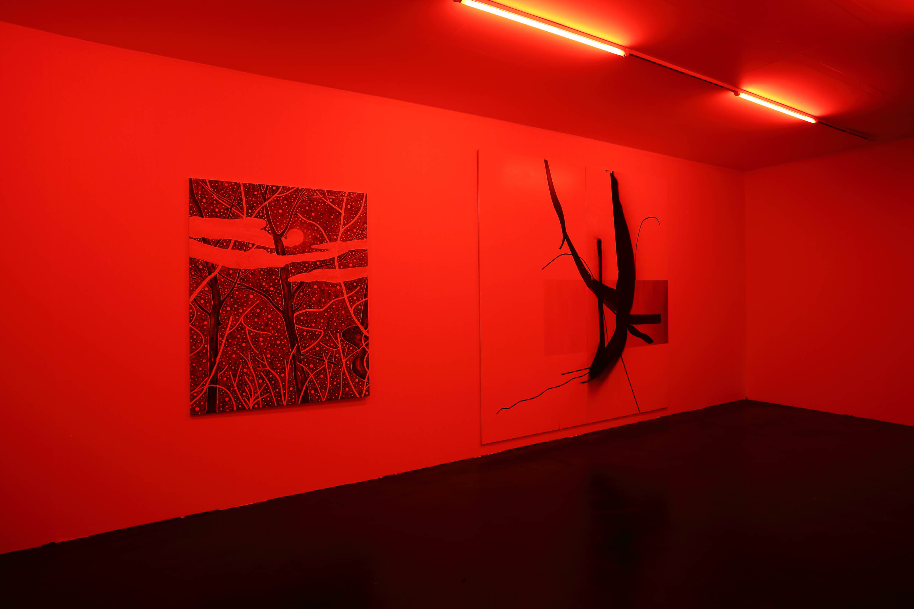 The work Untitled (in Red) (2016) by Heimo Zobernig deals with the question of display, or, more specifically, how an exhibition display may interact with the works it encloses, presents, enhances. At Art Cologne in 2016, Untitled (in Red) served as a somewhat dysfunctional display for two paintings by Albert Oehlen and Yuji Nagai: consisting of several red neon tubes that bathe the whole room as well as the works by Oehlen and Nagai in red light, it inevitably altered the visual quality of the paintings. Color nuances were erased and could only be perceived as chiaroscuro contrasts. At the same time, both works became readable through the same filter, became comparable on a level other than the motivic (both paintings show vegetative forms, trees). Furthermore, the atmosphere of the white-cube booth that is typically used as an exhibition display at art fairs was radically changed. The viewer was herself immersed in the red light and thus became aware of her own presence and relativity of appearance. The red color also transported another layer of meaning, as it recalled spaces with an ambiance of murkiness, ambivalence—"political red-light zones," as Zobernig puts it, and "Moulin Rouge" interiors. Zobernig worked with this strategy in a number of other shows: at Kunsthalle Wien in 1994, for example, his installation also entered into a dialogue with paintings by Albert Oehlen—a dialogue that would be resumed several times in various contexts. At Kunsthalle Zürich in 2011, which was at the time exhibiting in the Baroque rooms of the Museum Bärengasse, Untitled (in Red) was the title of Zobernig's solo show, in which the notion of color within architecture and exhibition display was even more rigorously highlighted.