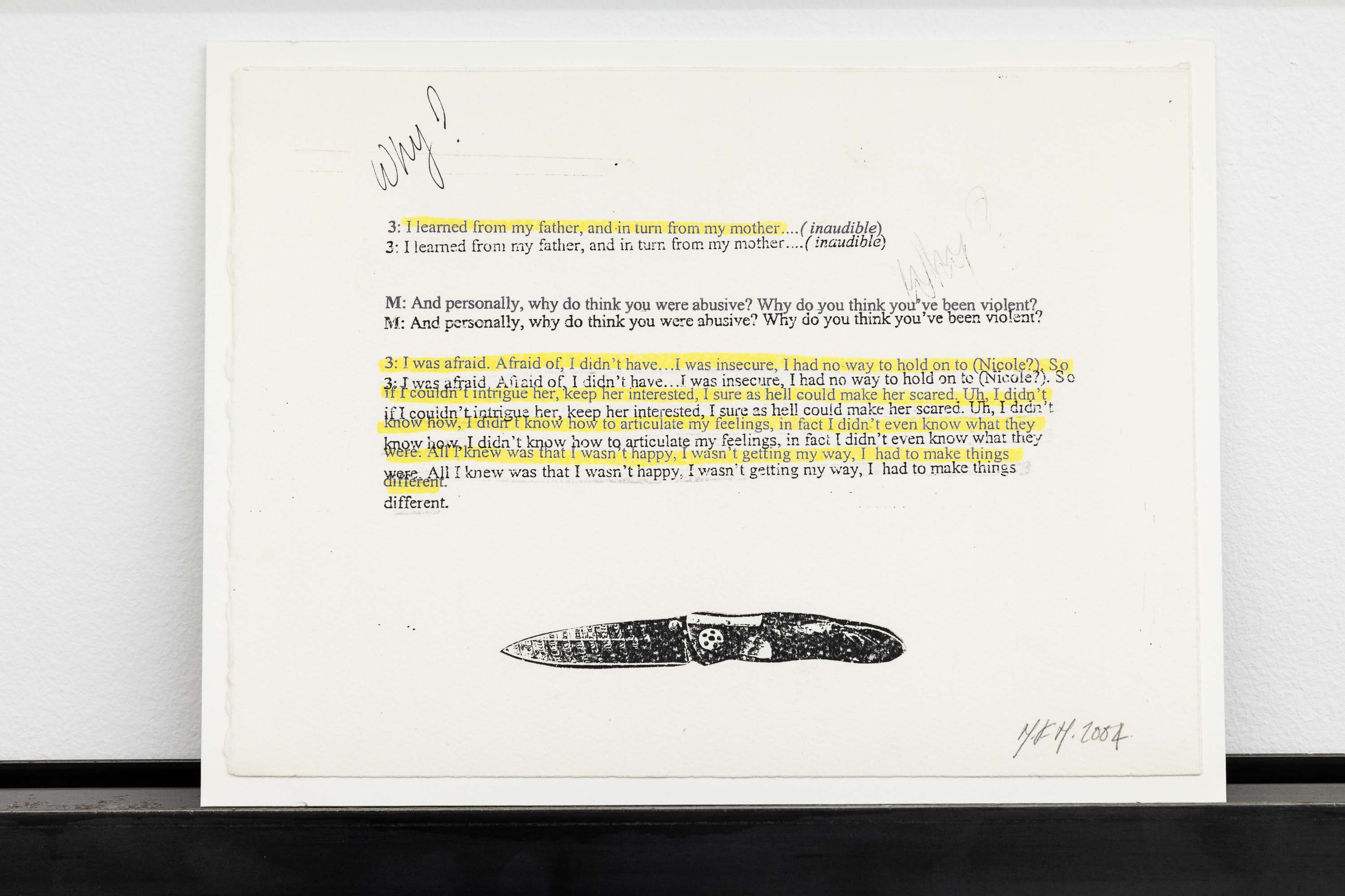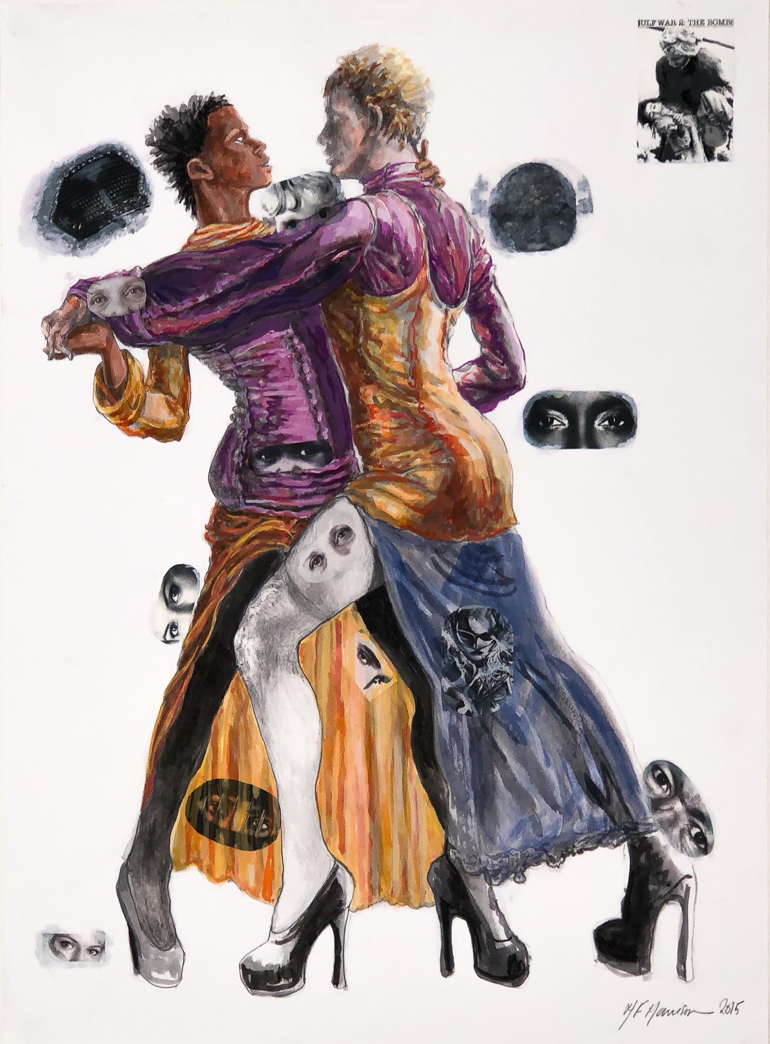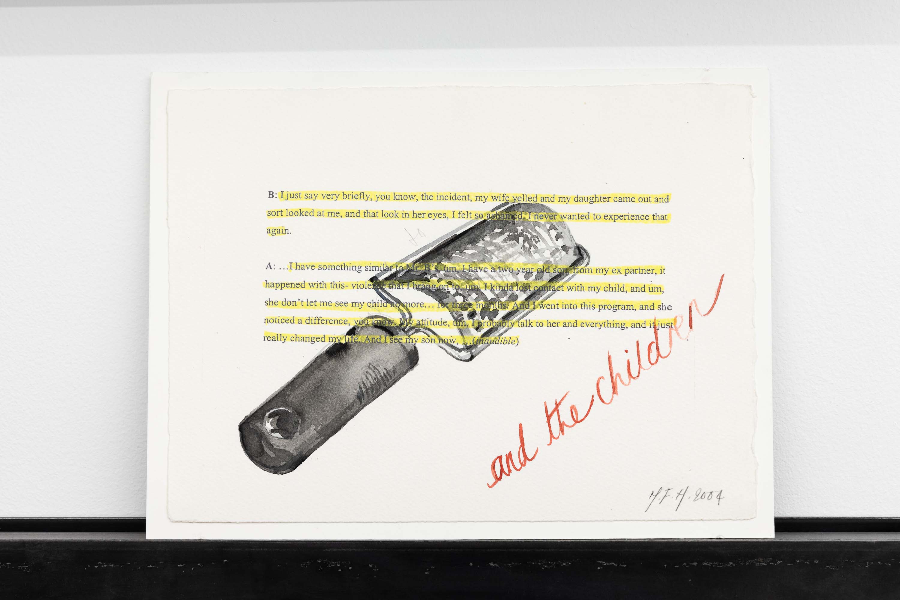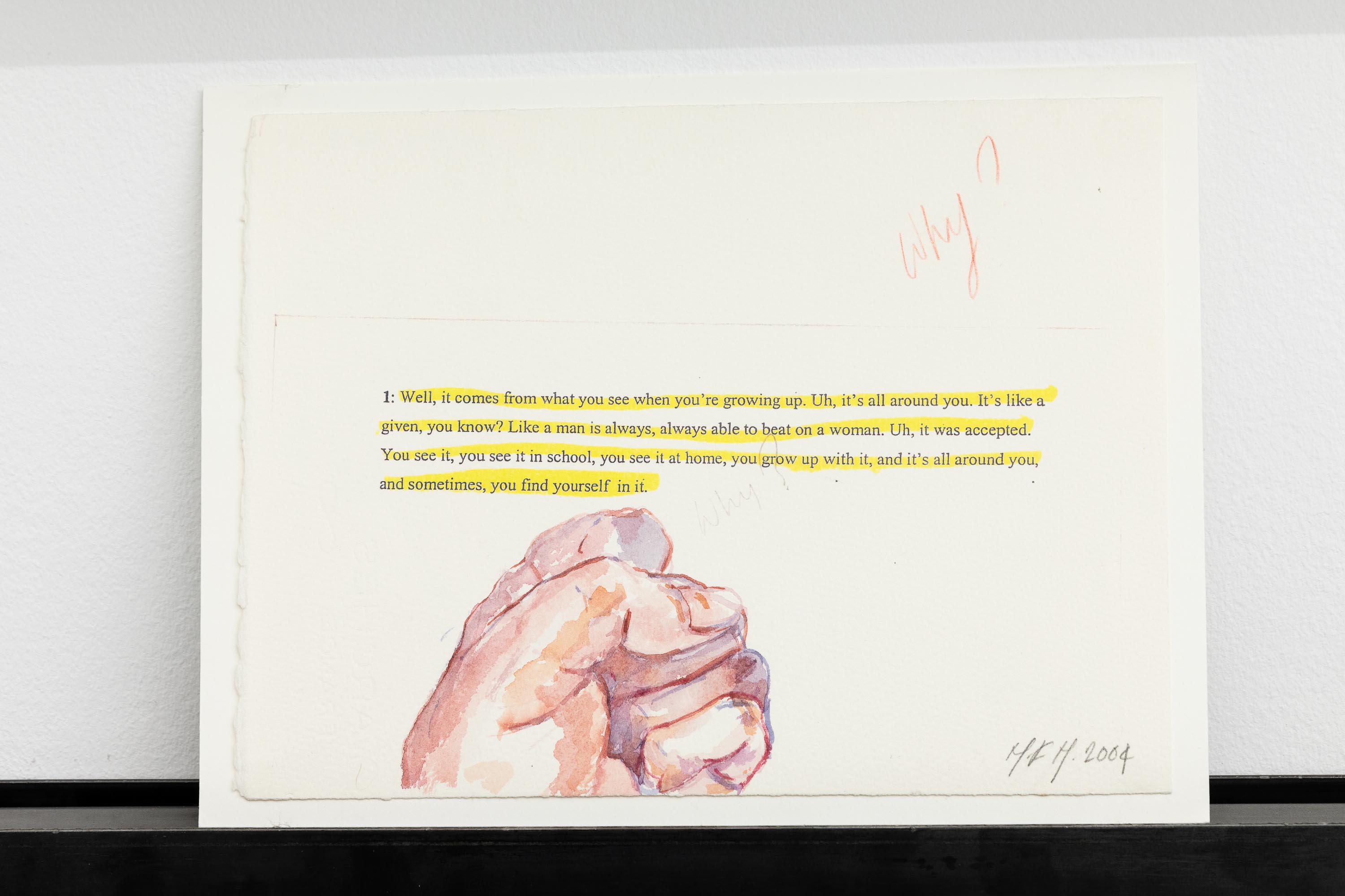 Violence against women is not an isolated fact, but a consubstantial fact to a violent and global patriarchal system. Showing the existing types of violence towards women and rejecting the typical victimist speech of a stereotyped and simplified feminism, Margaret Harrison researches and reports the process of beautify violence against women implemented by the contemporary patriarchal system. During the process of documentation for the artwork, Margaret Harrison contacted an agent that worked with inmates within the area of San Francisco, and asked her that, whenever she had her periodical interviews with the inmates convicted of violance towards women crimes, she asked them the reasons why they committed those crimes. To produce this piece, Margaret Harrison uses mixed-media collages, oil paintings and watercolours, exploring the aesthetic strategies to beautify violence against women. This work was described as “a field day of juxtapositions, as the bright and almost cheery colors of her paintings counter the often subdued and sometimes deadly topic: the various means of committing violence against women”.