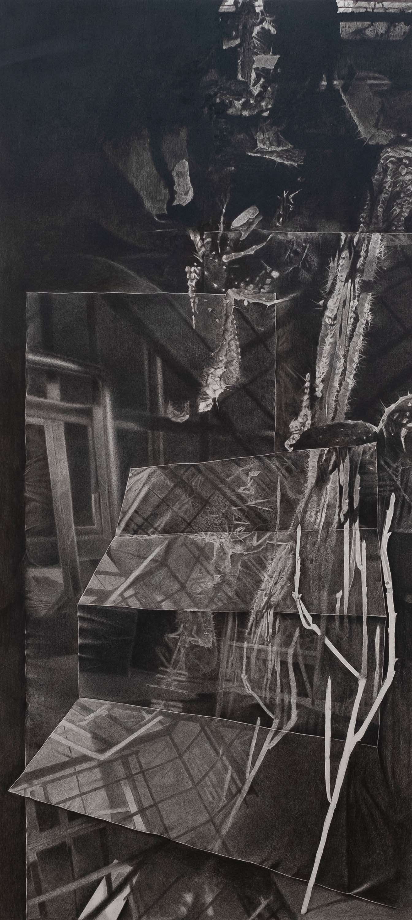 Anyone interested in figuring out Tobias Nussbaumer (*1987, Basel) should not allow themselves to be so easily seduced. As he himself says, the concept of deception serves as the point of departure for his work. For an artist who celebrates perspectival illusion as much as he does, this comes as no real surprise. With considerable diligence, Nussbaumer constructs brilliant spatial illusions. Vanishing lines, lighting, and shadows precisely set down on paper produce convincing spatial depths, powerfully drawing in the eye.