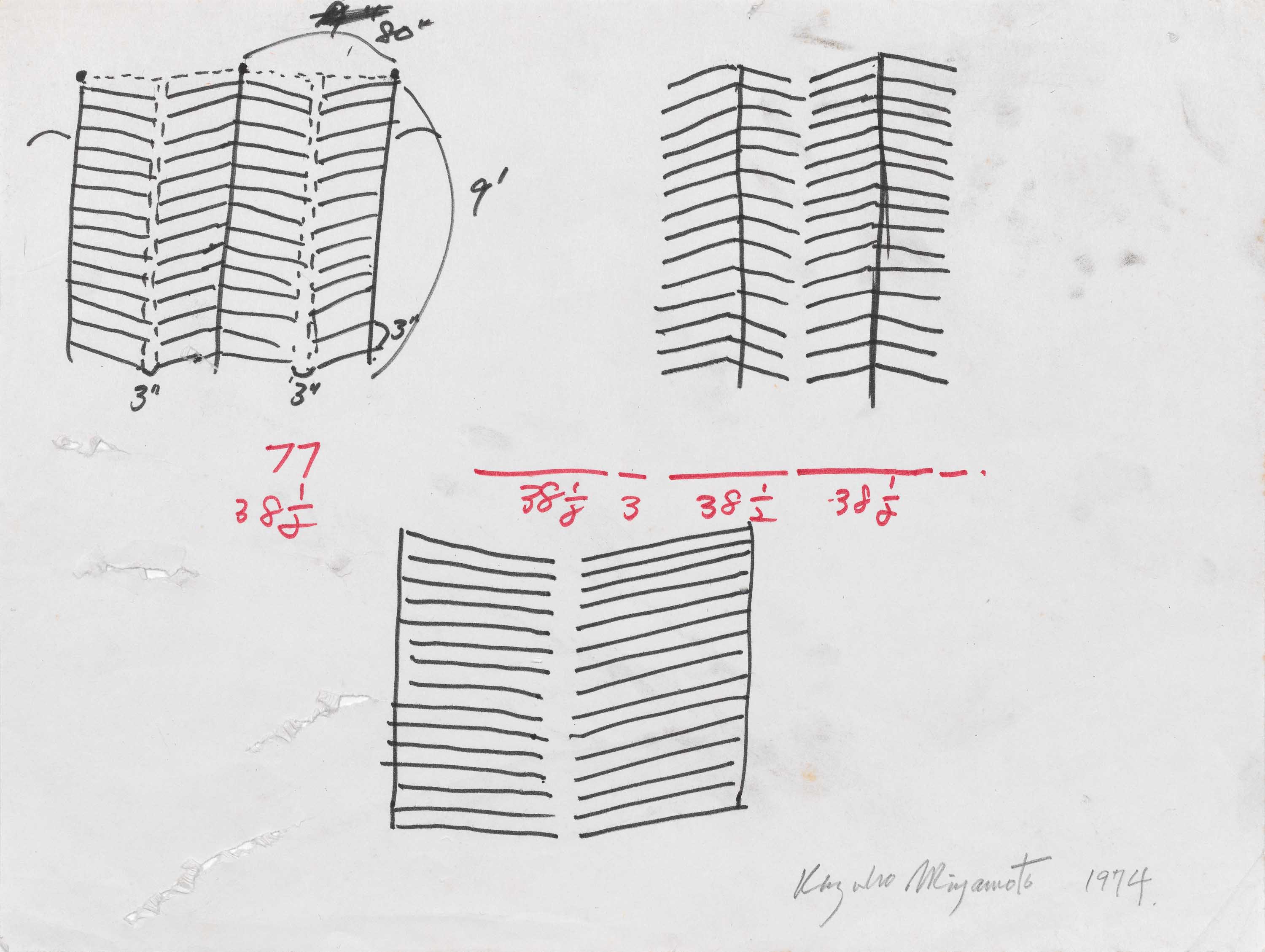 Miyamoto’s early large-scale paintings, often using geometrical language and grids, included personal markings, traces or smudges. This was her initial reaction to the strong and rigorous works of her male colleagues. Her practice quickly evolved to sculpture and drawings. Modular sculptures made with ropes, birch branches and other natural, readily available material, in geometrical shapes, led to experimenting with string interventions. Radical installations and included a two-dimensional Piece for the Wall in the Employee’s Cafeteria, MoMA, Untitled, 1973 (recreated for the 2023 exhibition at Madre (museo d’arte per le arti contemporanee), Naples, IT). As she shifted to these works starting in 1972, using industrial string or twine and nails, the floor, base or wall where they were installed were integral to the works. The works progressed very quickly from two to three-dimensions. The spatial illusion, shadows, lightness and luminosity as well as ephemeral qualities evolved. Fan-shapes or nets with cross strings, using her repetitive yet rhythmic motion and composition allowed for a very varied body of work. Many were conceived for specific spaces and exhibitions.