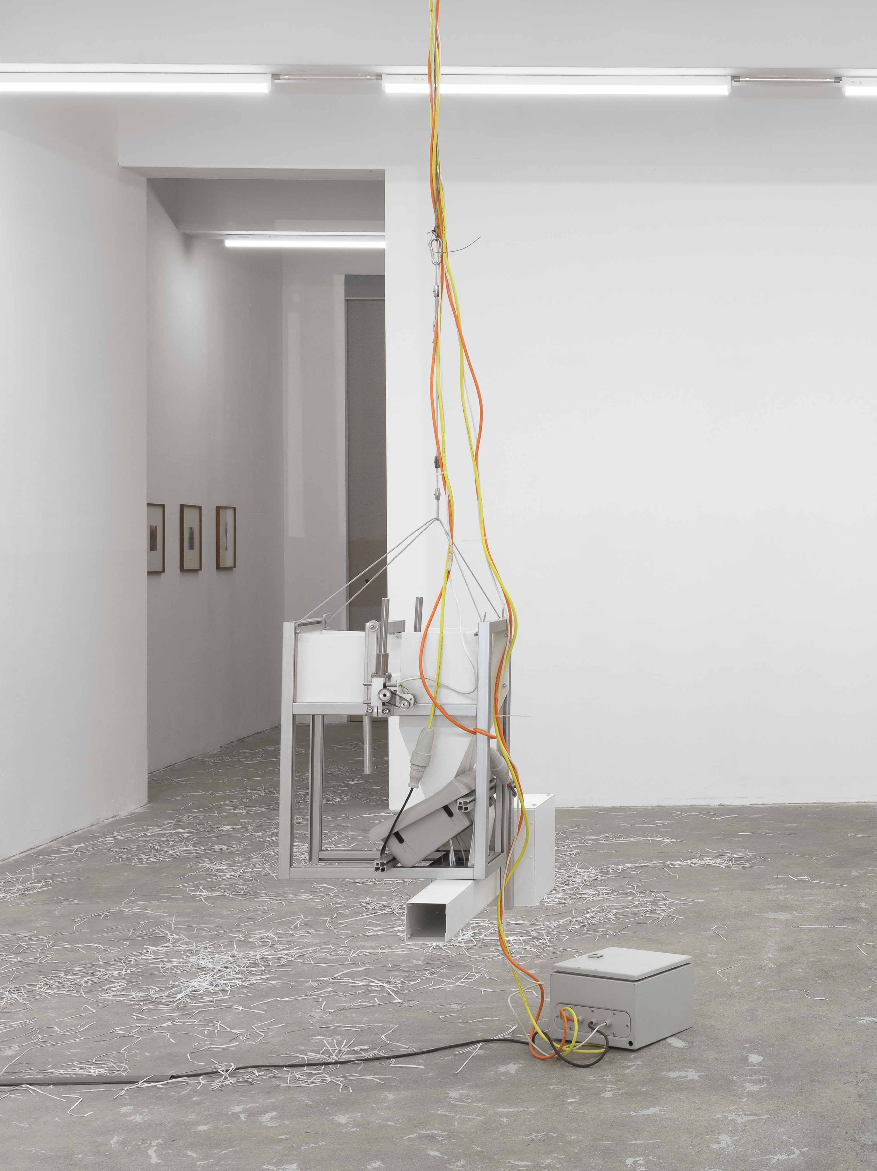 Laser print paper, shredder mechanics, aluminum, electric motors, electronic controls Dimensions variable (ca. 130 × 96 × 64 cm)