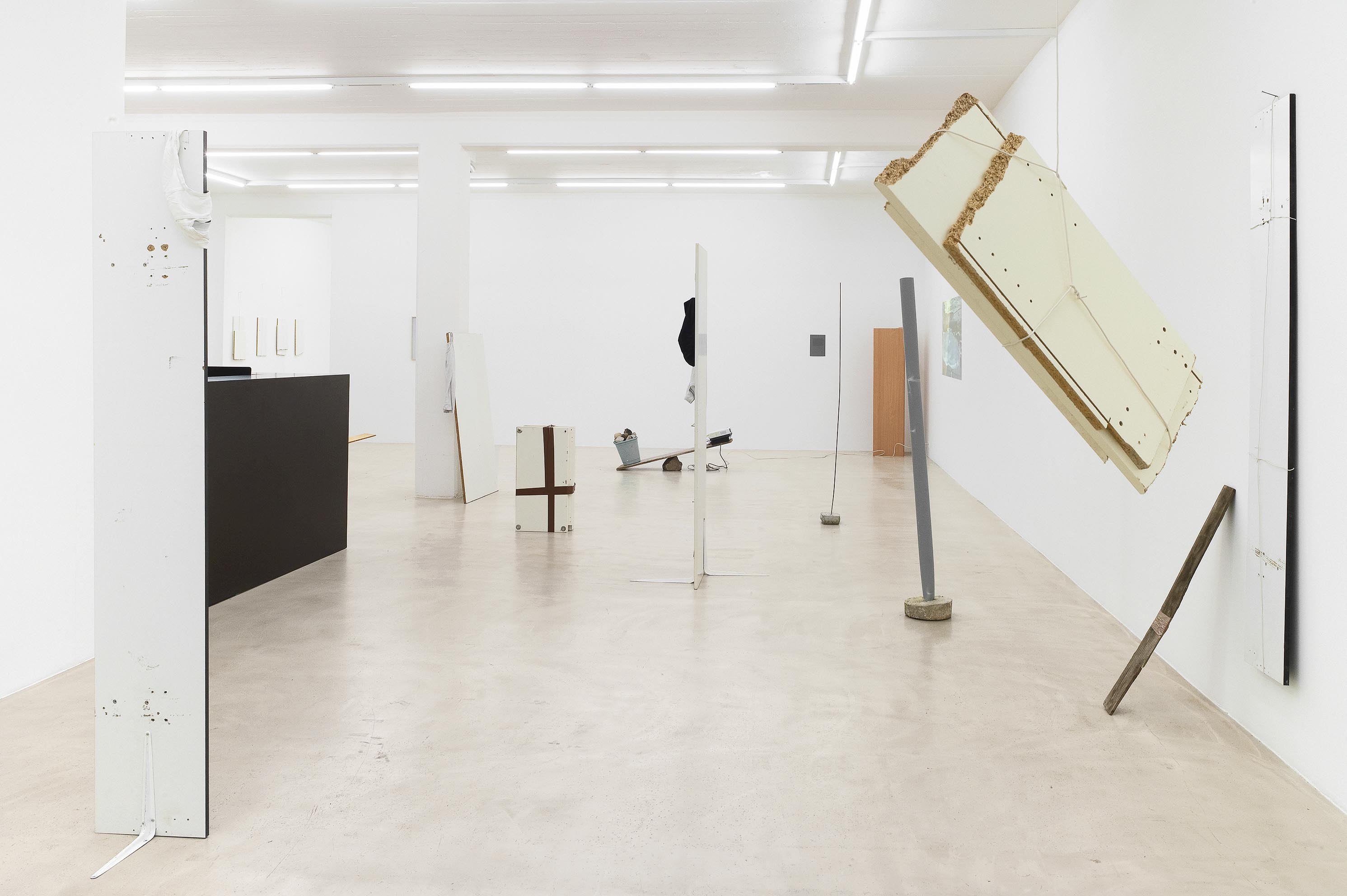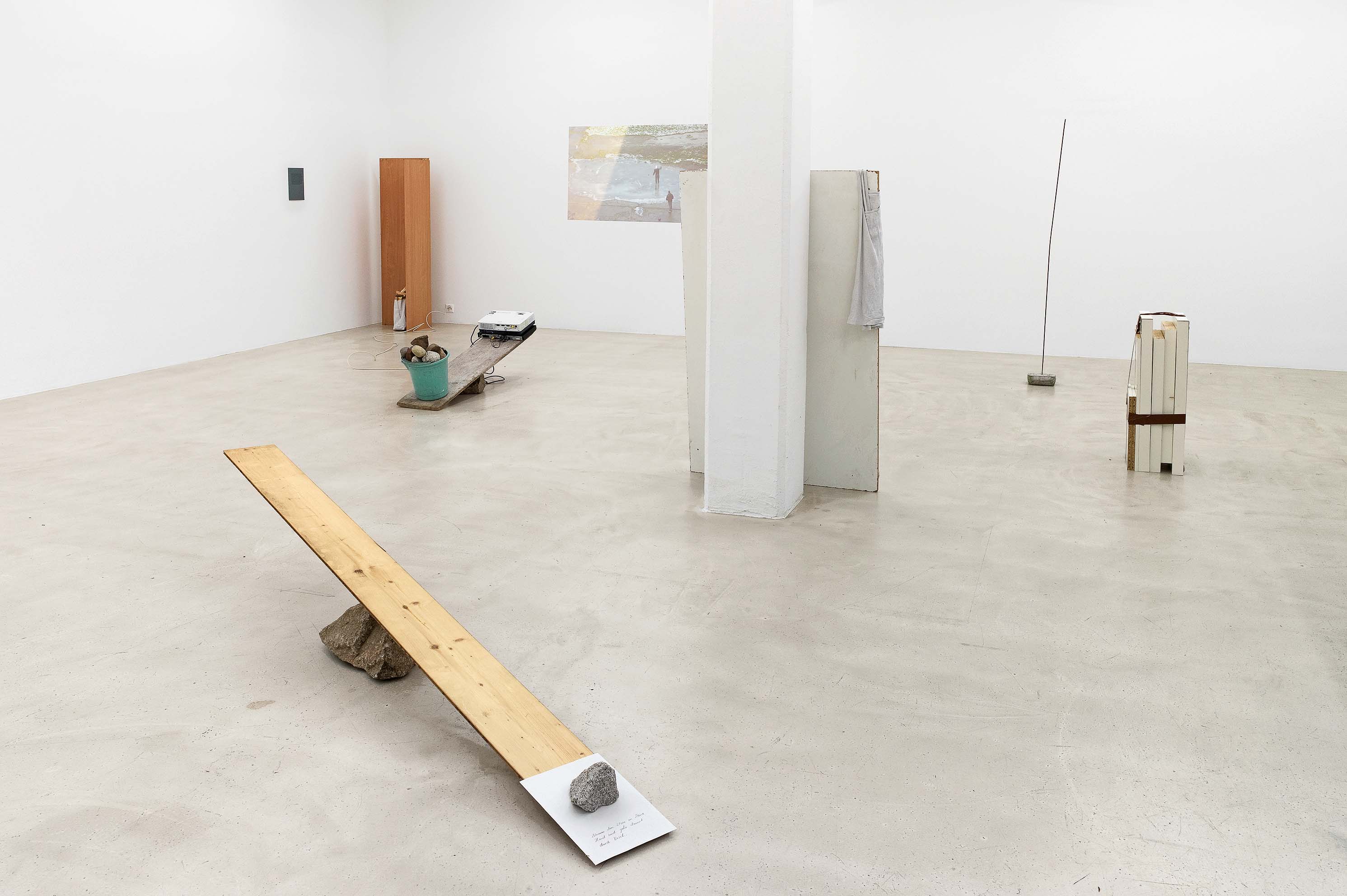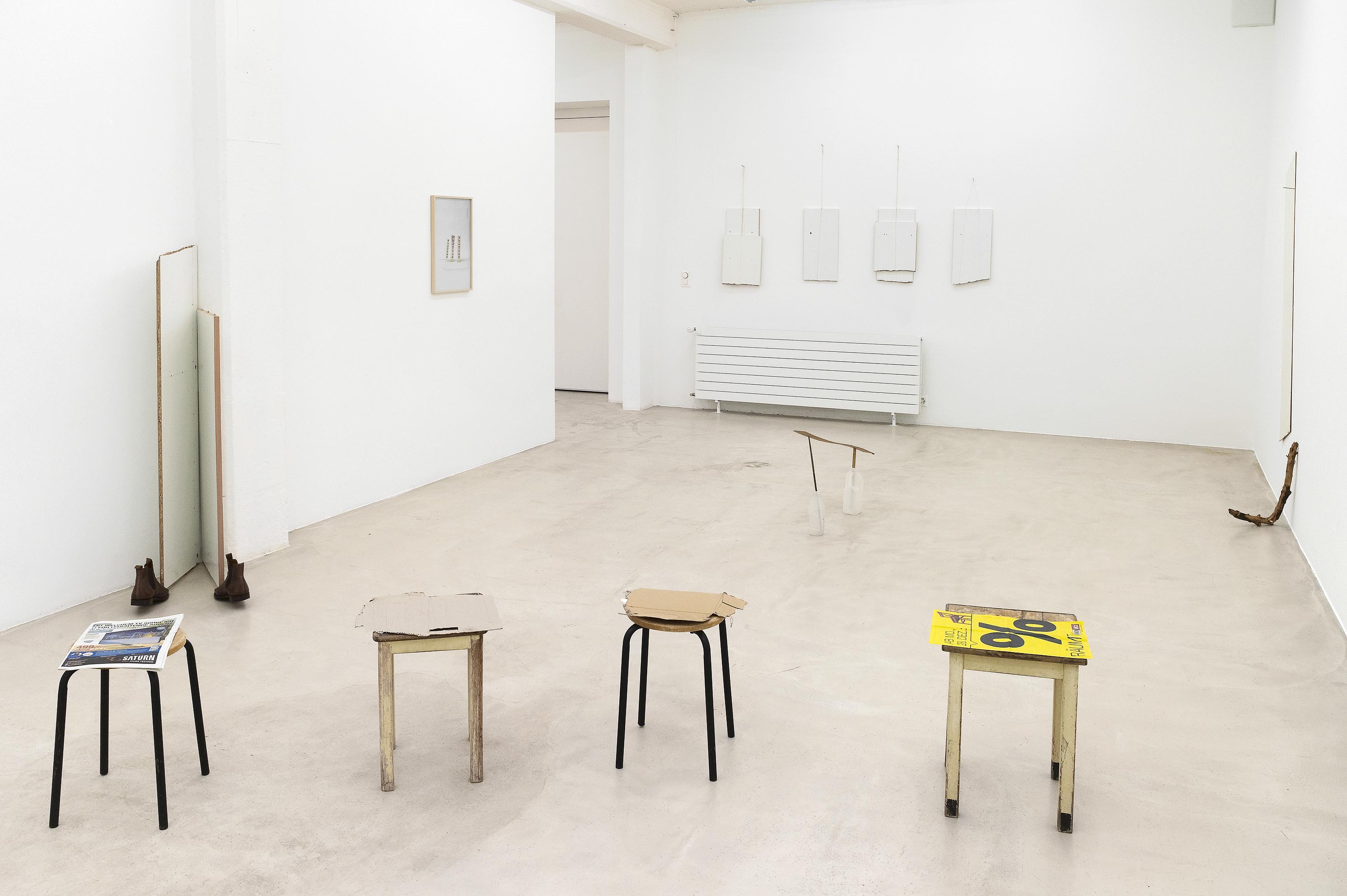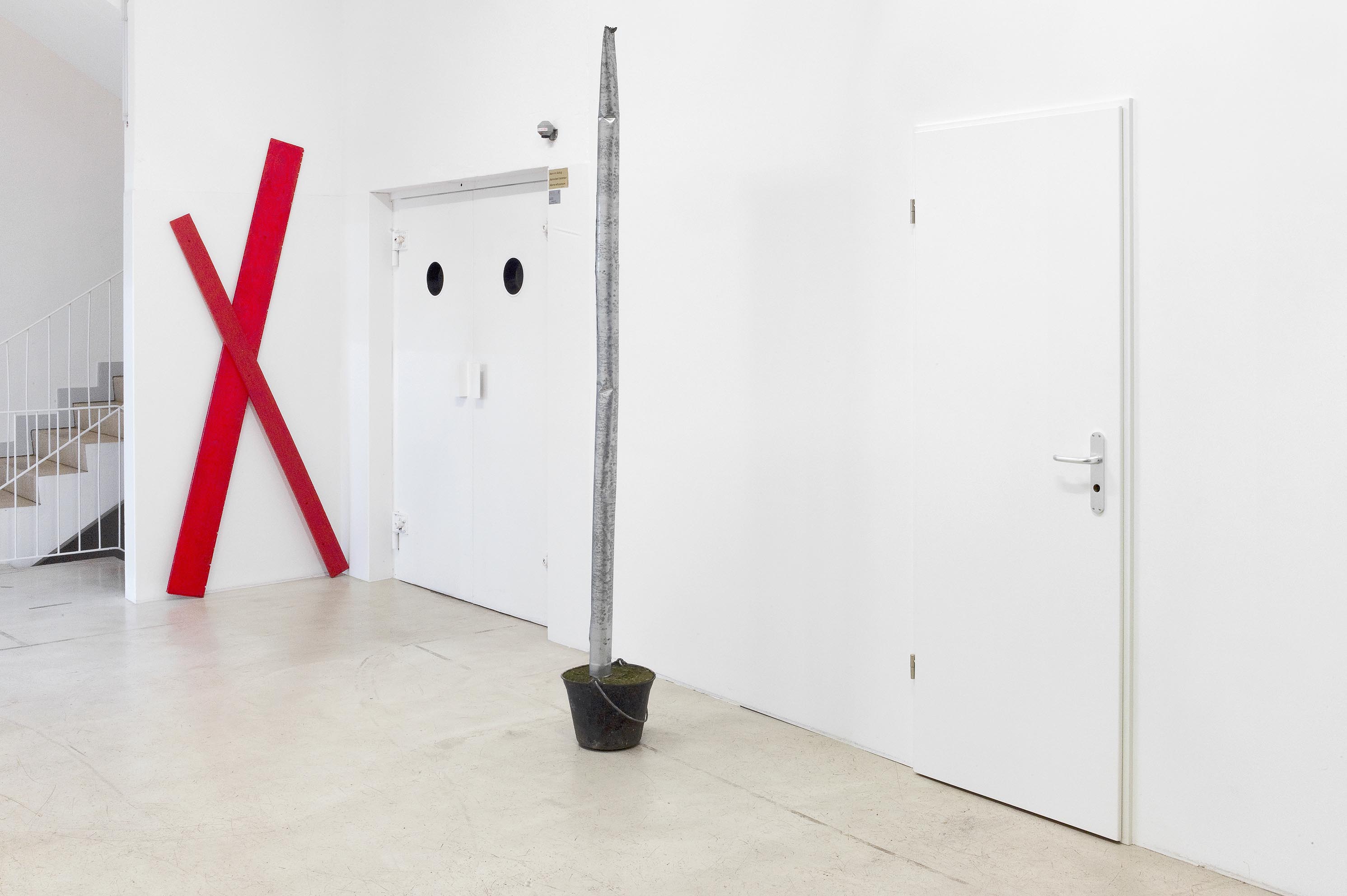 Bretter eben (Simply planks) is the first direct encounter of works by Eric Hattan (*1955, Wettingen, Switzerland) and Thomas Geiger (*1983, Lörrach, Germany) within an exhibition. Both share an interest to shift existing situations in (public) space with simplest means, actions or sculptural interventions to sound out existing limits, rules and possibilities. “It has always been the noble responsibility of art to put a stick in the machine of our conventions.”(1) This time the sticks have literally become planks, which are leaning against house walls (Thomas Geiger), or are just hanging on the walls (Eric Hattan). What unites all works is the question of balancing forces. This is experienced sculpturally in Hattan’s pieces and, in Geiger’s approach referred to social realities as echoed in the title Arbeite Arbeite Arbeite - Revolte Revolte Revolte (Work Work Work – Revolt Revolt Revolt), 2016.