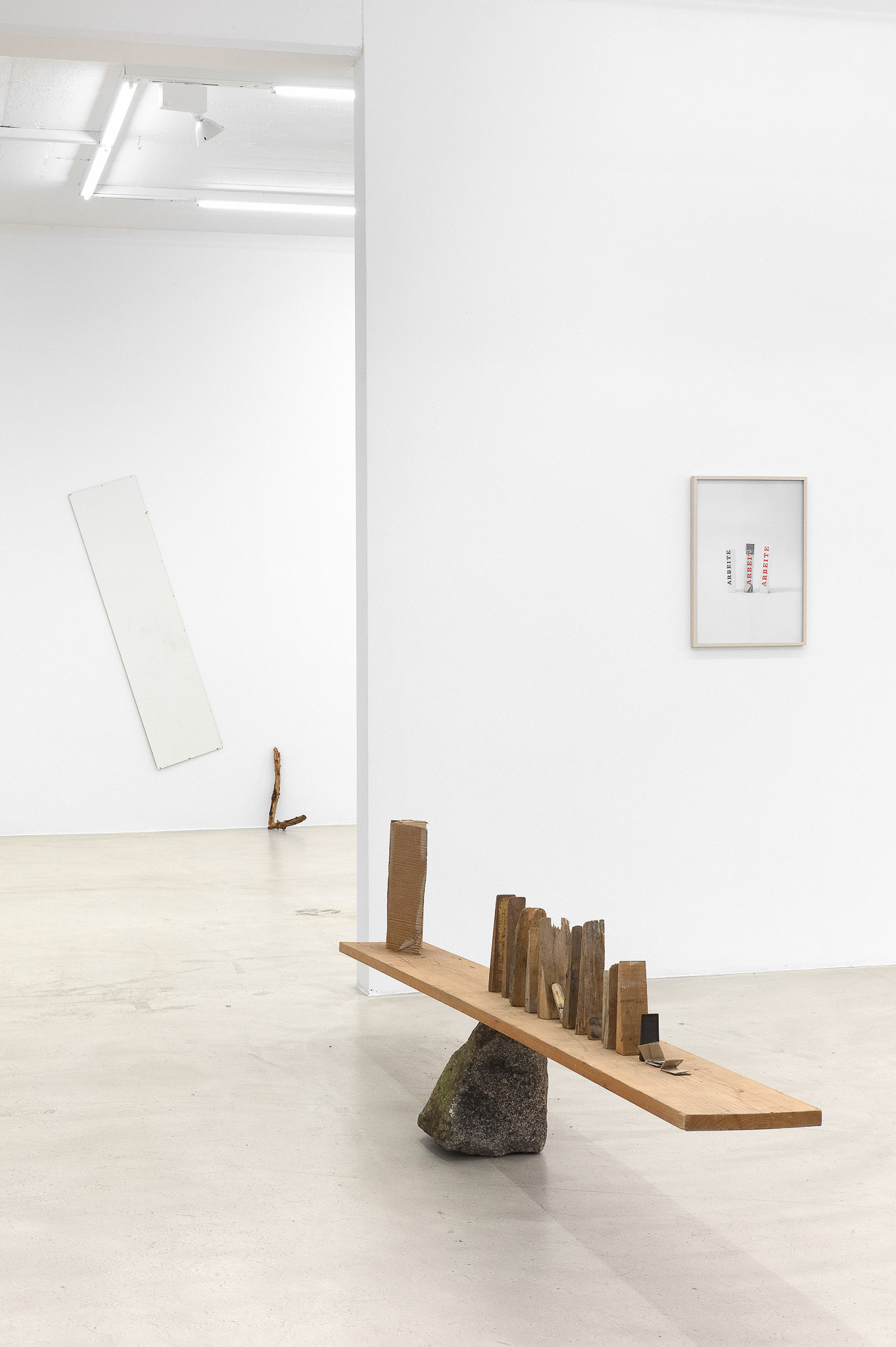 „Es gehörte immer schon zu den noblen Aufgaben der Kunst, dann und wann ein Stöckchen ins Getriebe unserer Konventionen zu werfen"(1) – nur diesmal sind aus dem Stöckchen buchstäblich Bretter geworden, welche mal an Hauswände gelehnt sind (Thomas Geiger) oder einfach an der Wand hängen (Eric Hattan). Was alle Arbeiten vereint, ist die Frage nach Kräfteverhältnissen, die wie im Fall von Hattans Arbeiten skulptural erfahrbar werden und bei Geiger auf soziale Gegebenheiten verweisen, ganz dem Credo der gleichnamigen Arbeit folgend: Arbeite Arbeite Arbeite - Revolte Revolte Revolte (2016).