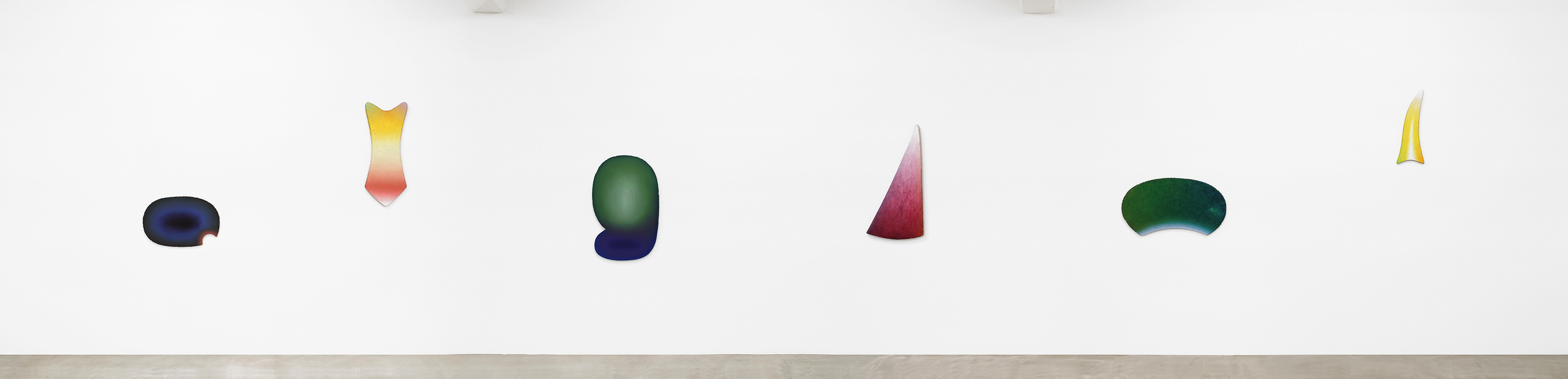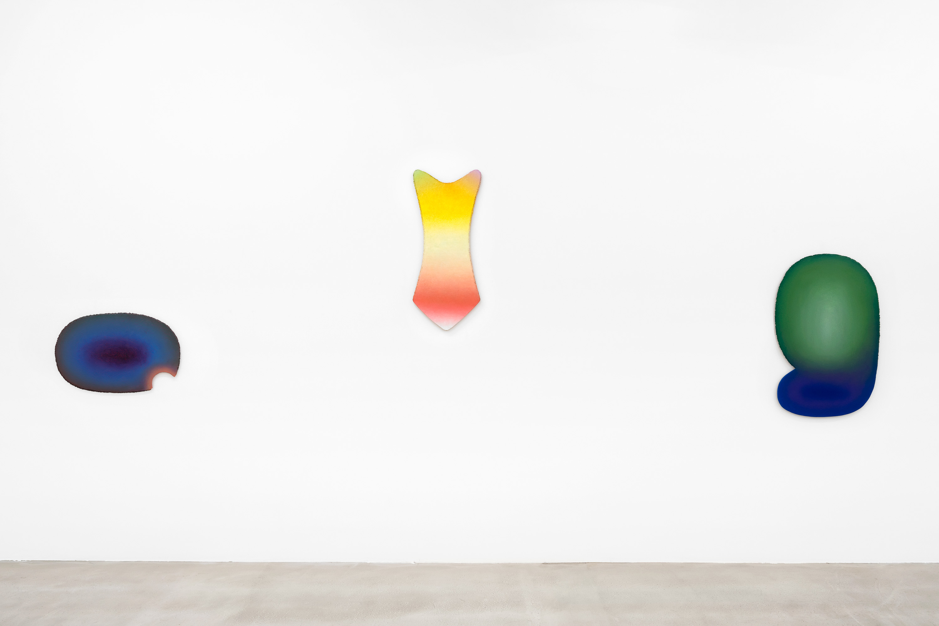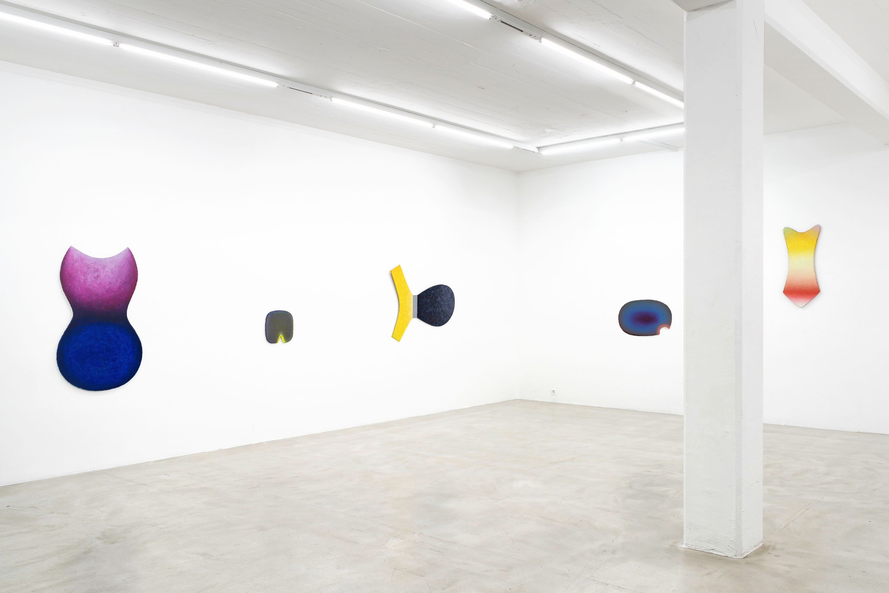 Jochims manipulates his painting supports as much as the surface itself. He contemplates each shape and selectively activates its edges by chipping the wood with tongs. Jochims then patiently chooses color gradations that seem to belong to the shape’s demand: some shift quickly and dramatically, while others dissolve slowly and subtly. He later adds an open-ended title that does not necessarily relate back directly to his source material but may trigger other associations such as cities, ancient cultures, influential artists, and mythical beings. Finally, he selectively chooses the placement and hanging height of each individual work according to their color, visual weight, and direction. With a distinctive methodology, Jochims creates new autonomous pictorial forms with their own intricacies and self-reflexive logic.