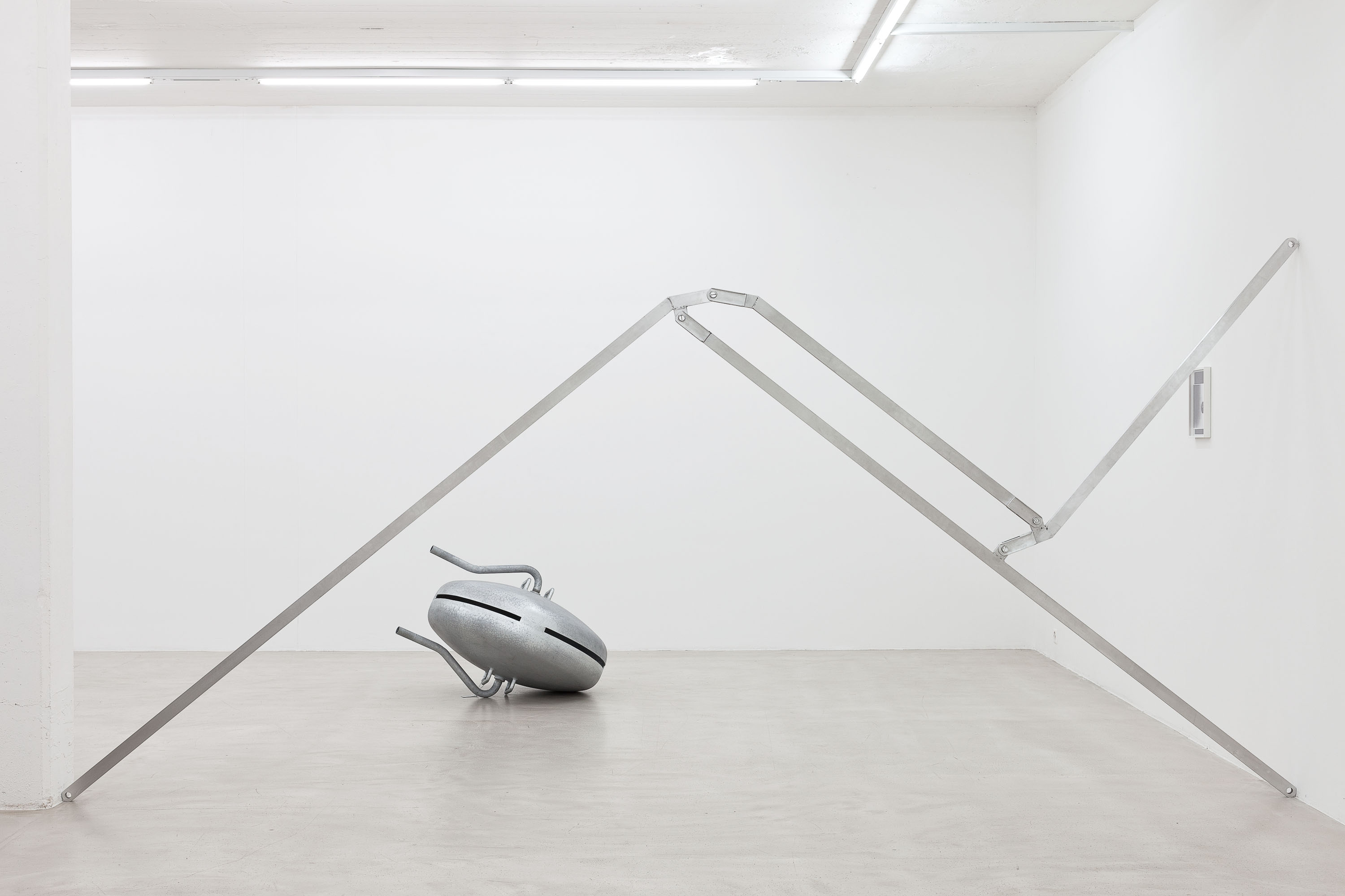 A suspended object in steel and glass, the outline of which could remind you of a surveillance camera; geometric forms like lines or shapes in reddish chamotte clay; minimal sculptural figures from metal or planks that could be architectural models – if it were not for their size preventing that reading. Black and white photographs of building masses that show actual situations in urban spaces, yet still seem strangely unreal.