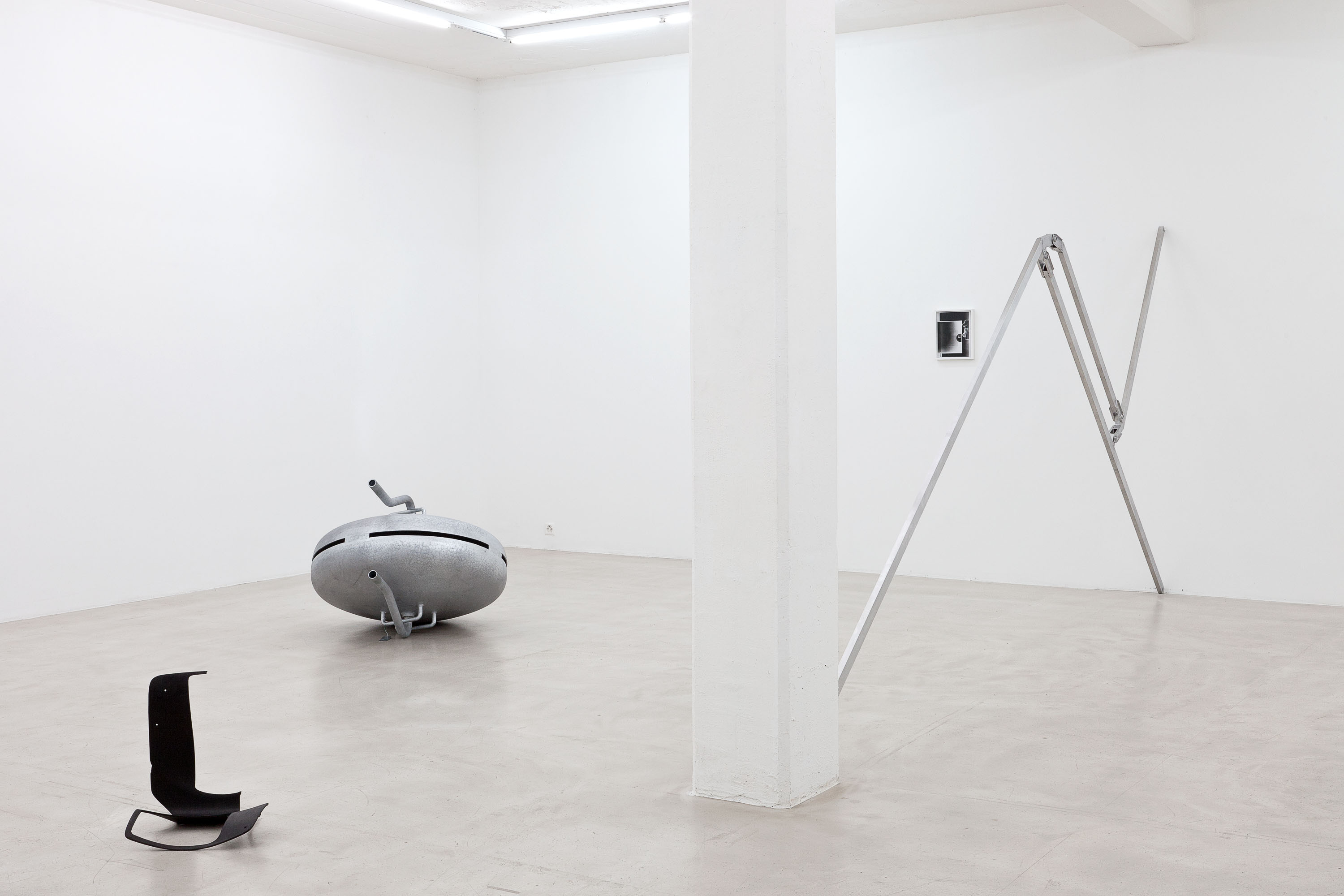 Ein hängendes Objekt aus Stahl und Glas, das in seinen Umrissen an eine Überwachungskamera denken lässt; geometrische Formen wie Linien oder Flächen aus rötlichem Schamott; minimale skulpturale Gebilde aus Metall oder Holzplatten, die Architekturmodelle sein könnten – wären da nicht ihre Masse, die sich diesem Eindruck verweigern. Schwarz-Weiss-Fotografien von Baukörpern, die reale Situationen im urbanen Raum zeigen, zugleich aber merkwürdig unwirklich anmuten.