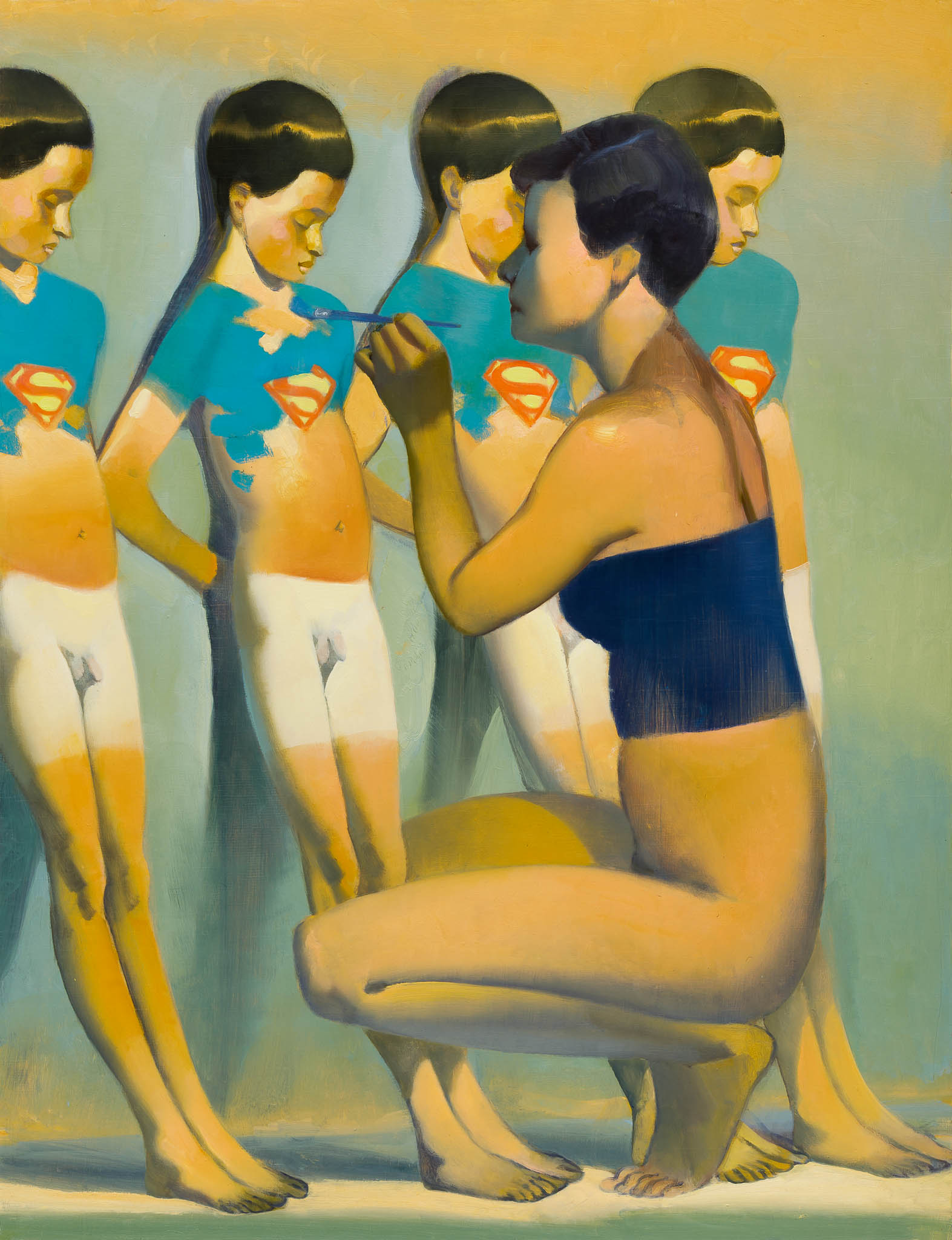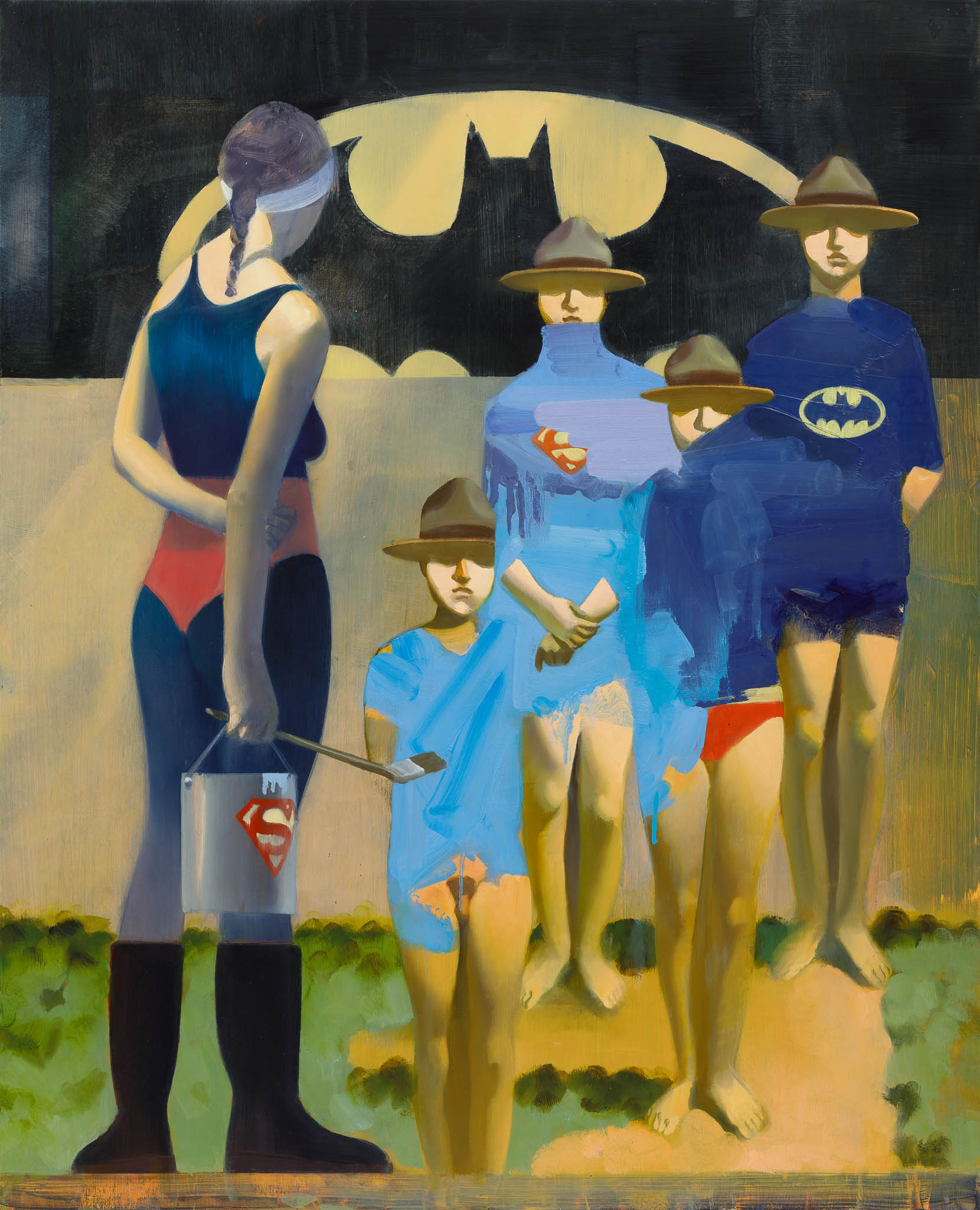 Many of the figures actually hold paintbrushes, as if they are painting the layers of one other until the story is complete. In the titular piece, a group of figures stand at attention like soldiers wearing matching trooper hats as Batman’s logo glows behind them in the night sky. In front of them, a woman holding a paint can with the Superman logo on it stops mid-stroke, taking a break from her work. It’s as if the painter awoke in the middle of a dream and allowed you to step inside his mind as the rendered he scene on the canvas.