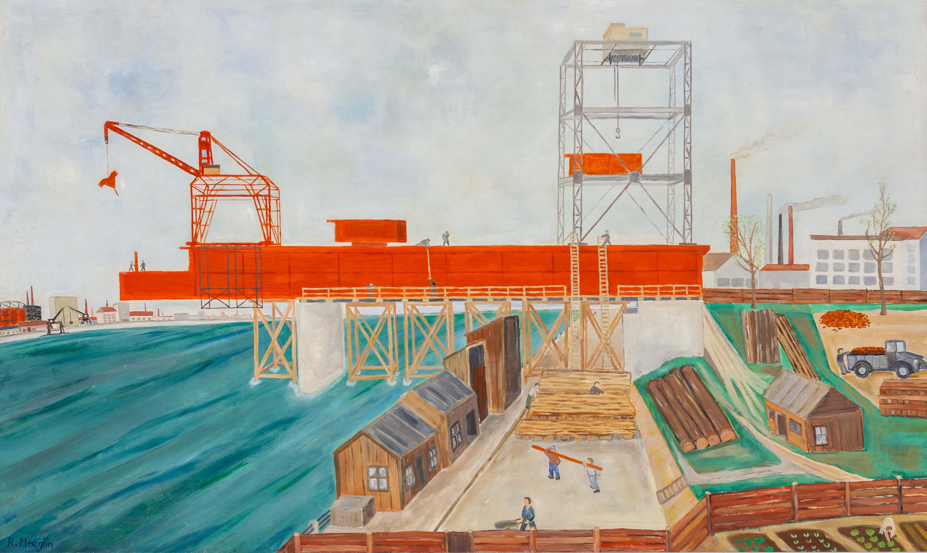It is as if the workers are seen through the eyes of a child. The painter, as a youngster, gaping in wonder at the world of adults: Is it not the case that they are all constructors, bigger and more powerful than him? With a few brushstrokes, Maeglin succeeded in giving the portrayed workers, at the building site, harbour or factory, the mark of a fleeting personality – a small miracle of reduction and a sign of painterly modesty at the same time.