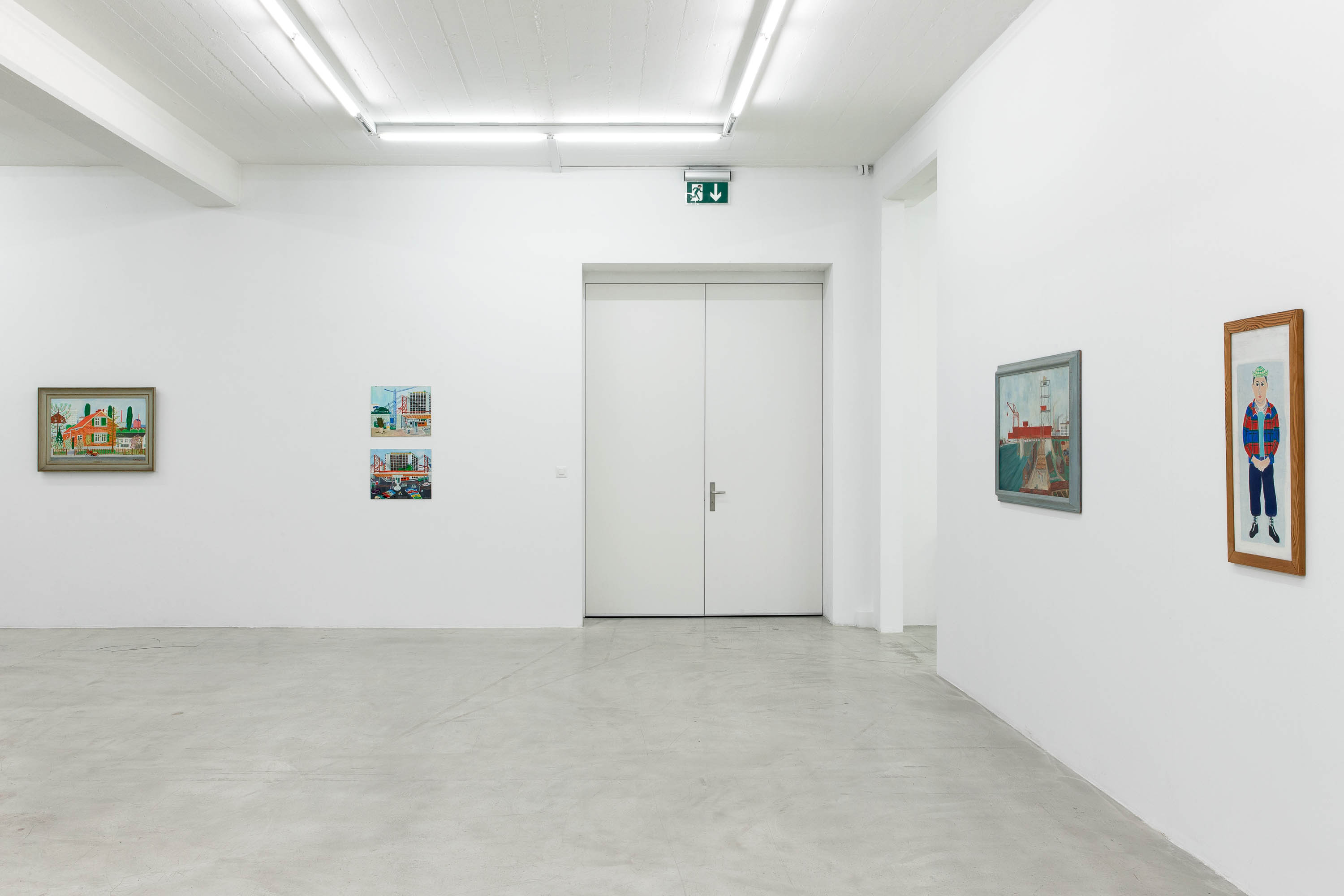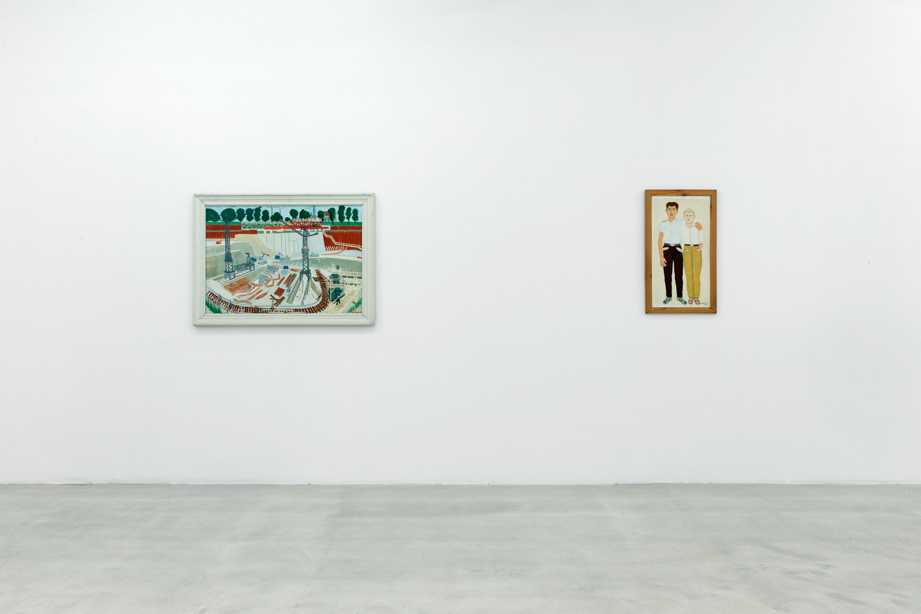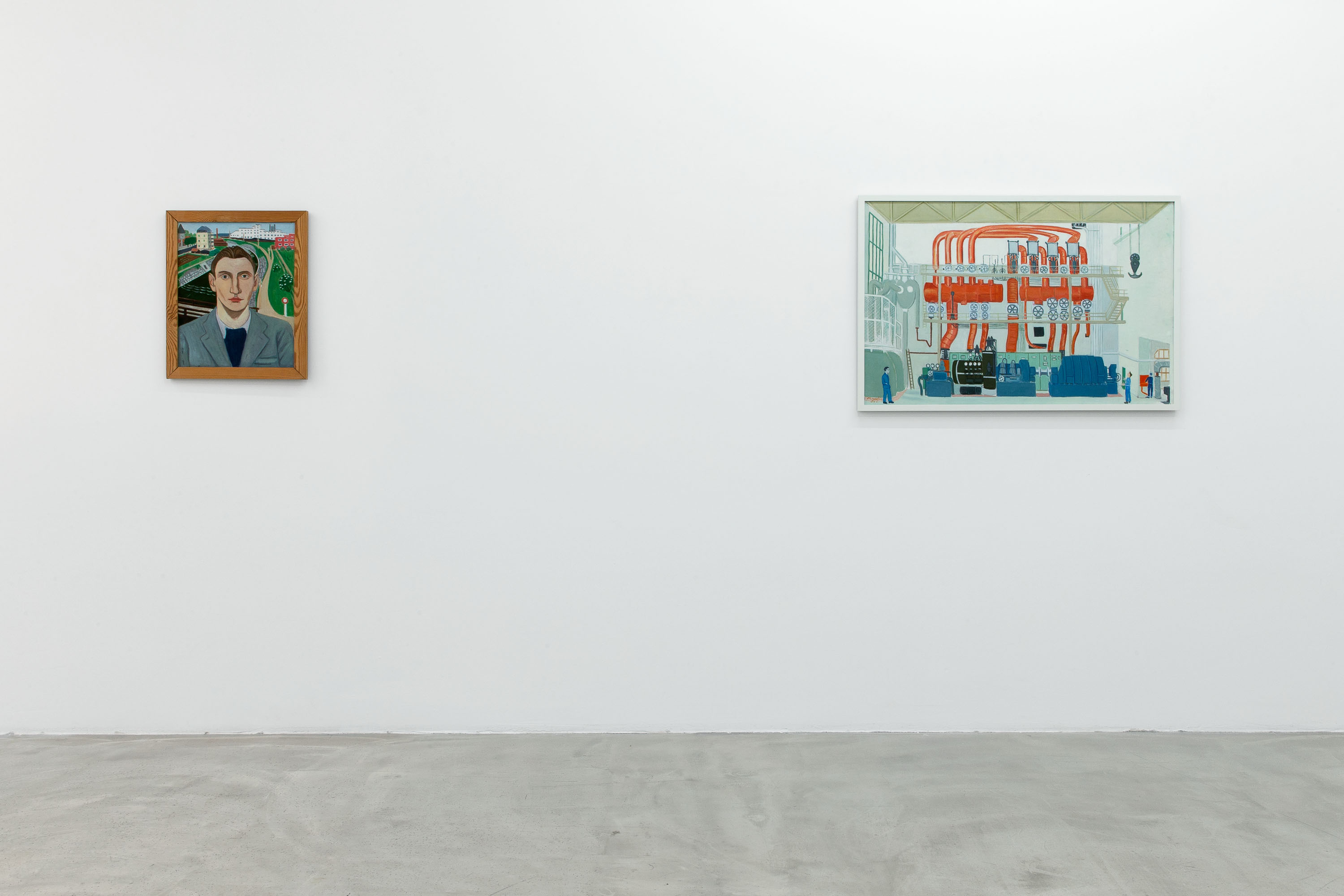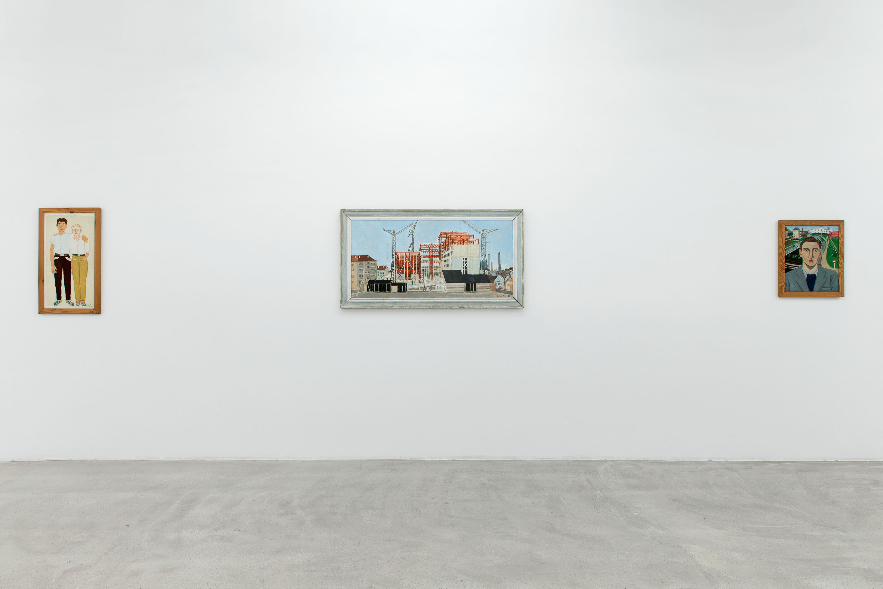 Maeglin consistently worked with a vibrant palette, often using shades of green and swaths of red. Do the latter indicate socialist sympathies? Alongside Walter Bodmer and Meret Oppenheim, he became a member of the antifascist collective of Swiss artists Gruppe 33, a few years after he had moved across the Rhine from Grossbasel to the industrial working-class Kleinbasel. Spending time at the Klybeck port while supporting himself as a manual laborer and by working in the chemicals industry, Maeglin immersed himself in his subject matter, possibly as a political stance and, one can speculate, in an attempt to explore his sexuality more freely. He remained in this adopted community for the rest of his life, painting dozens of portraits of people from the neighborhood in a body of work from the 1960s. The presentation at Galerie Mueller focused on this group in oil on small vertical pieces of hardboard. Many show young men set against green or red backdrops, posing with pouty lips or a hand on a cocked hip, as in Jüngling (Youngster), 1959, and Blonder Jüngling (Blond Youngster), 1960. Numerous preparatory line drawings from this series were also on view, which, with their careful attention to the male form, bear comparison to Andy Warhol’s more explicitly erotic drawings from the late 1950s as parallel forays into queer figuration. Both artists’ works feel fresh decades later. Framed by the portraits that bookend his oeuvre, the Maeglin retrospective animated his harmonious building sites as open-ended places of possibility, situated at an intersection of voyeurism and ideology. These places were his great muses, and as such were inextricably intertwined with desire.