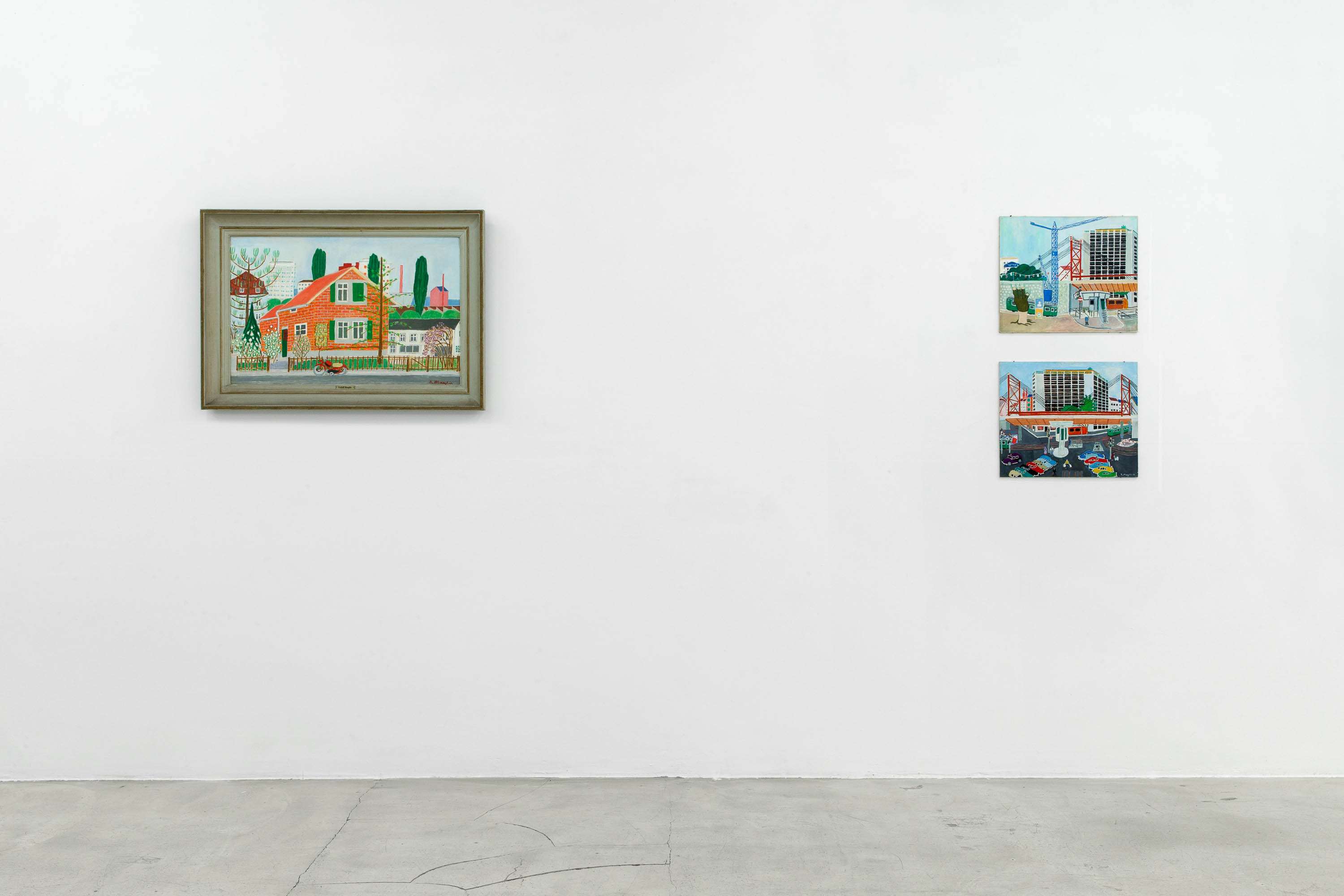 So aber bin ich ganz überrascht, als ich rechts vor der Empfangstheke nochmals drei ganz andere Bildtypen entdecke. Zwei der drei zeigen die Basler Heuwaagestation um 1969, das dritte Werk ist ein einzelnstehendes Privathaus. Hier leben die Bilder durch eine kraftvoll buntere Farbpalette auf und strahlen eine Dynamik aus, die einen Kontrast zu den anderen Bildern im Raum setzen. Das Motiv des Privathauses stellt zudem einen persönlicheren Bezug her. Wie wir später erfahren werden, ist es das Atelierhaus des Künstlers.