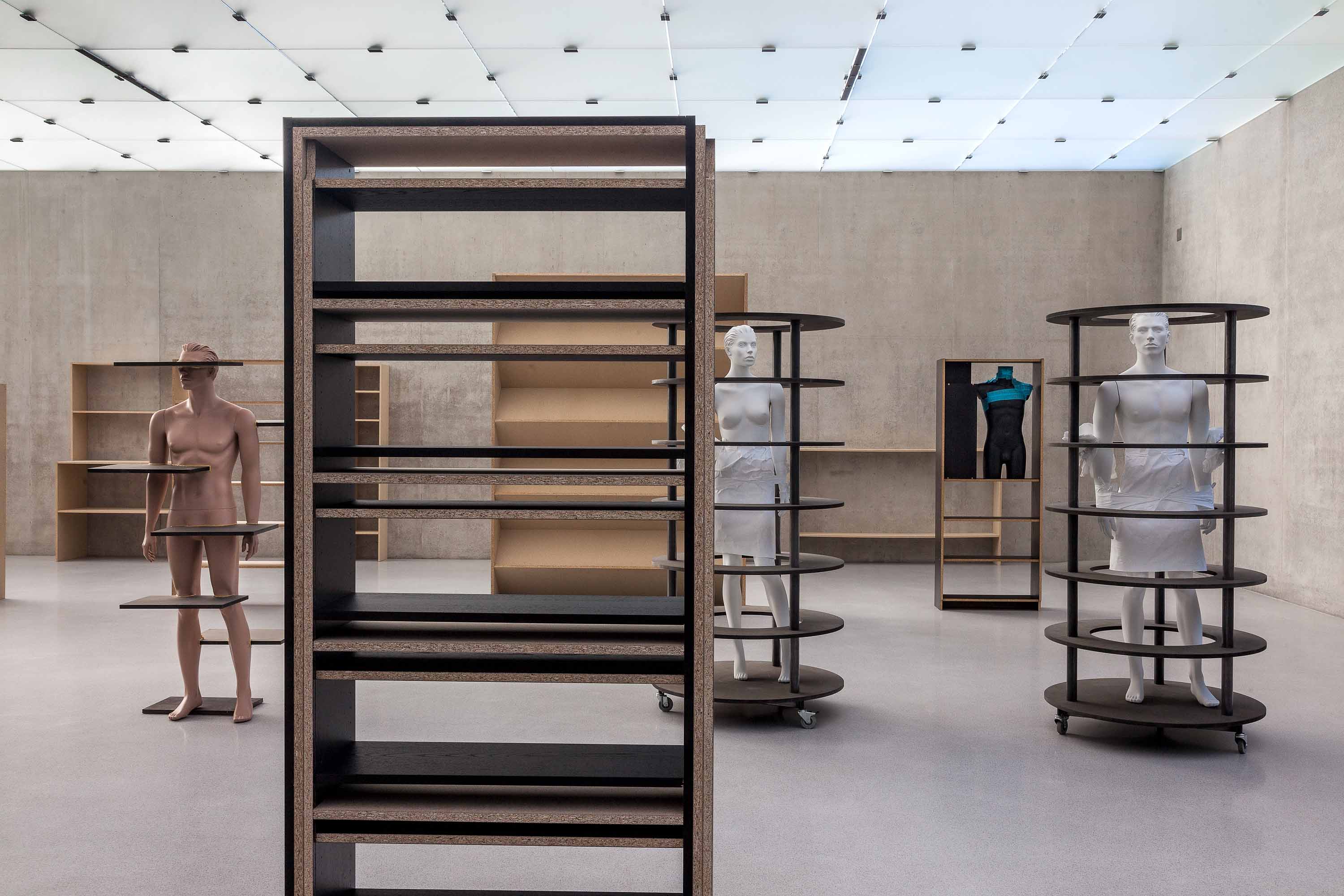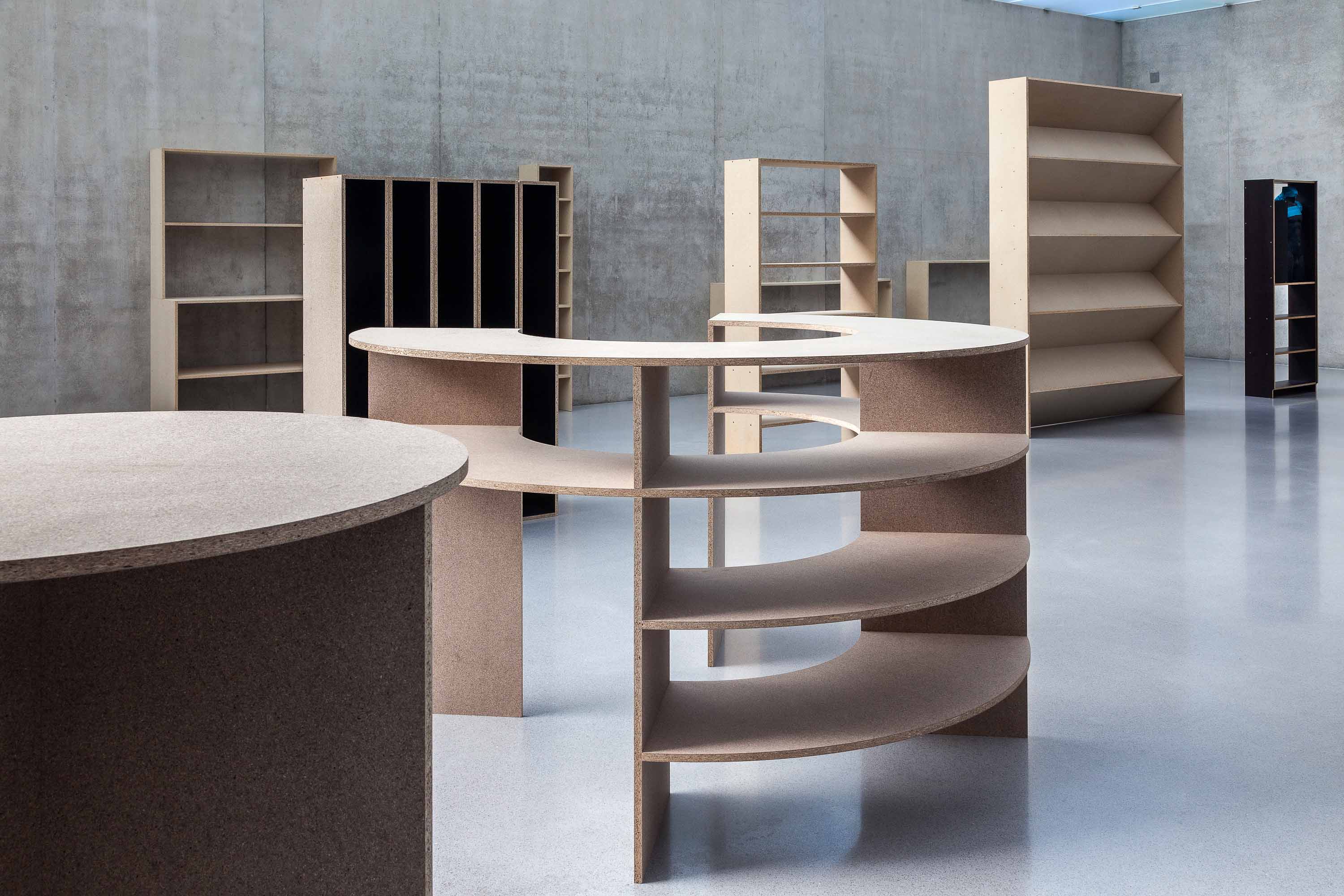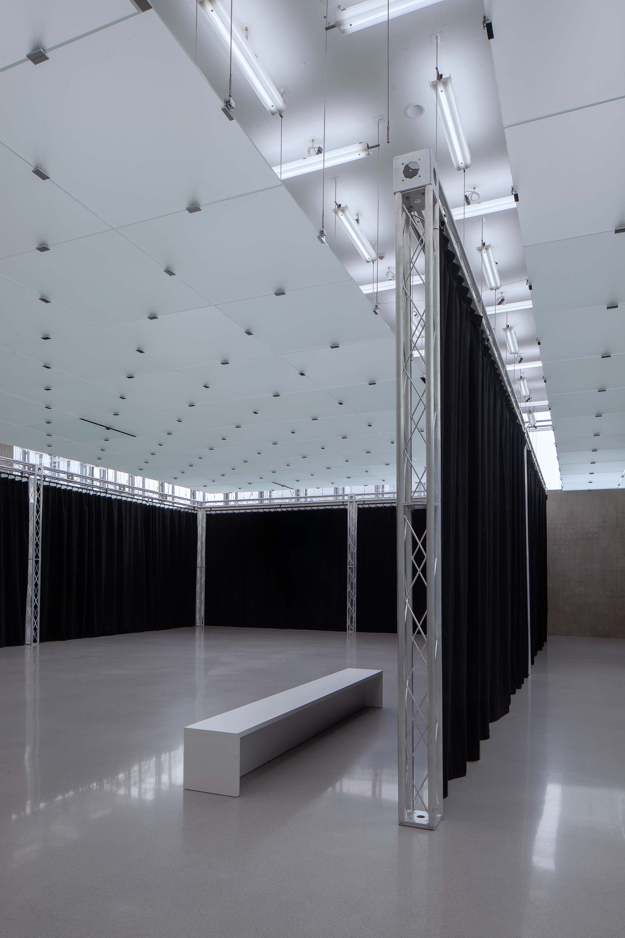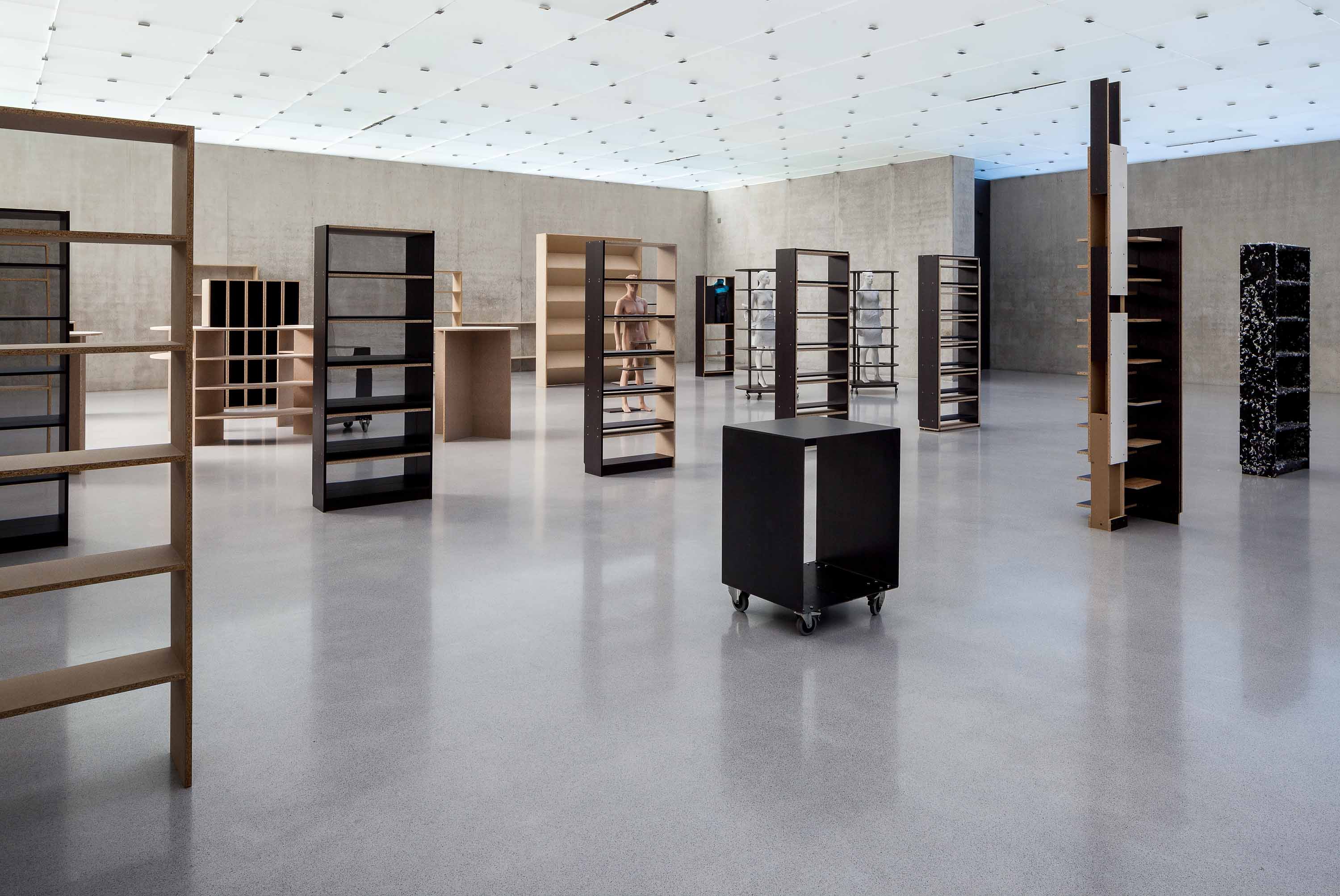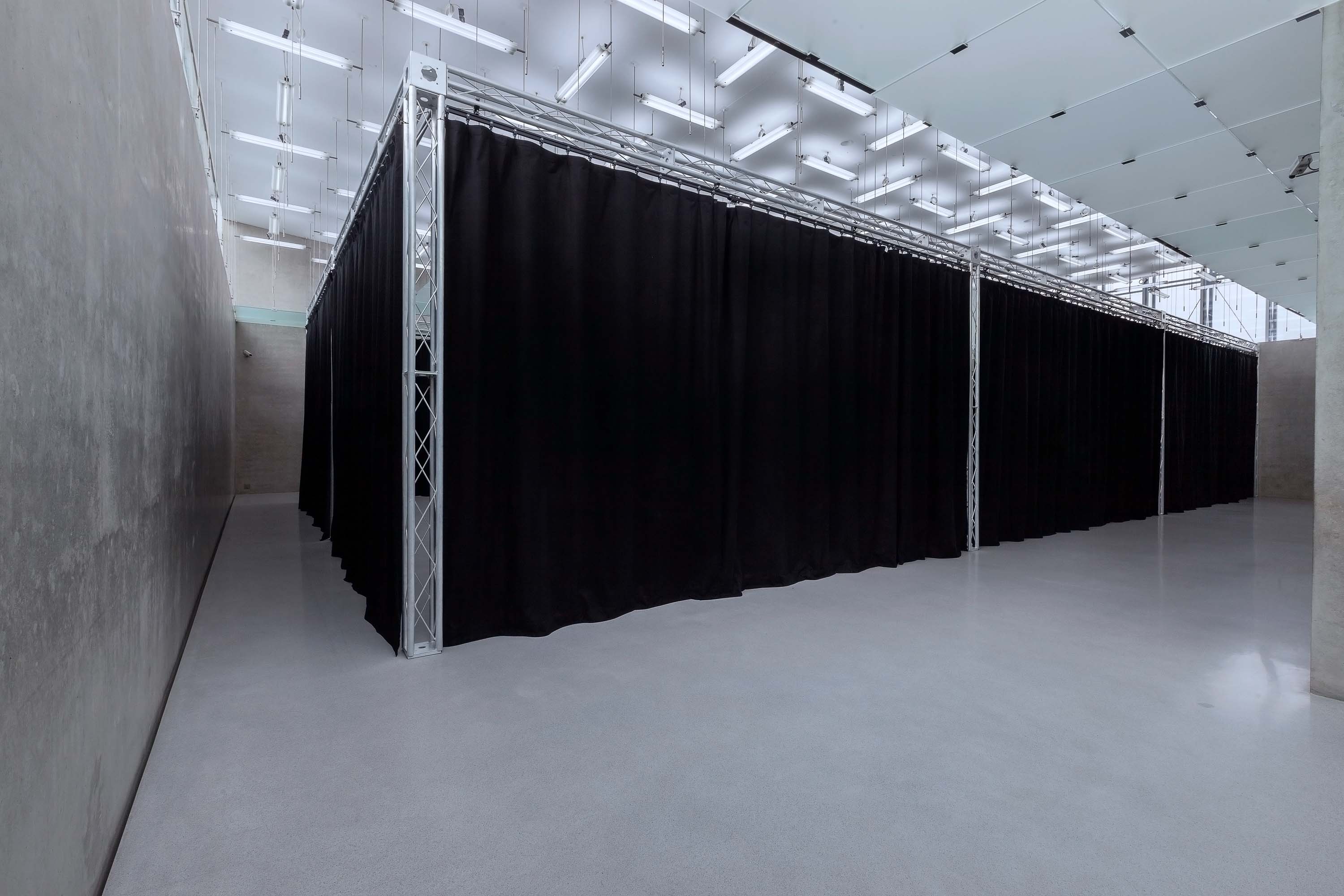 In his exhibition at Kunsthaus Bregenz Heimo Zobernig is showing a variety of empty shelving on the first floor. For Zobernig shelves exhibit a relationship to human scale, never merely functional but always also becoming, as he expresses it, a »counterpart.« The second floor is divided by a black curtain that enters into a symbiosis with KUB’s architecture. Visitors entering are faced with the decision of whether to experience the newly created space surrounded by fabric, or peer behind the curtain.