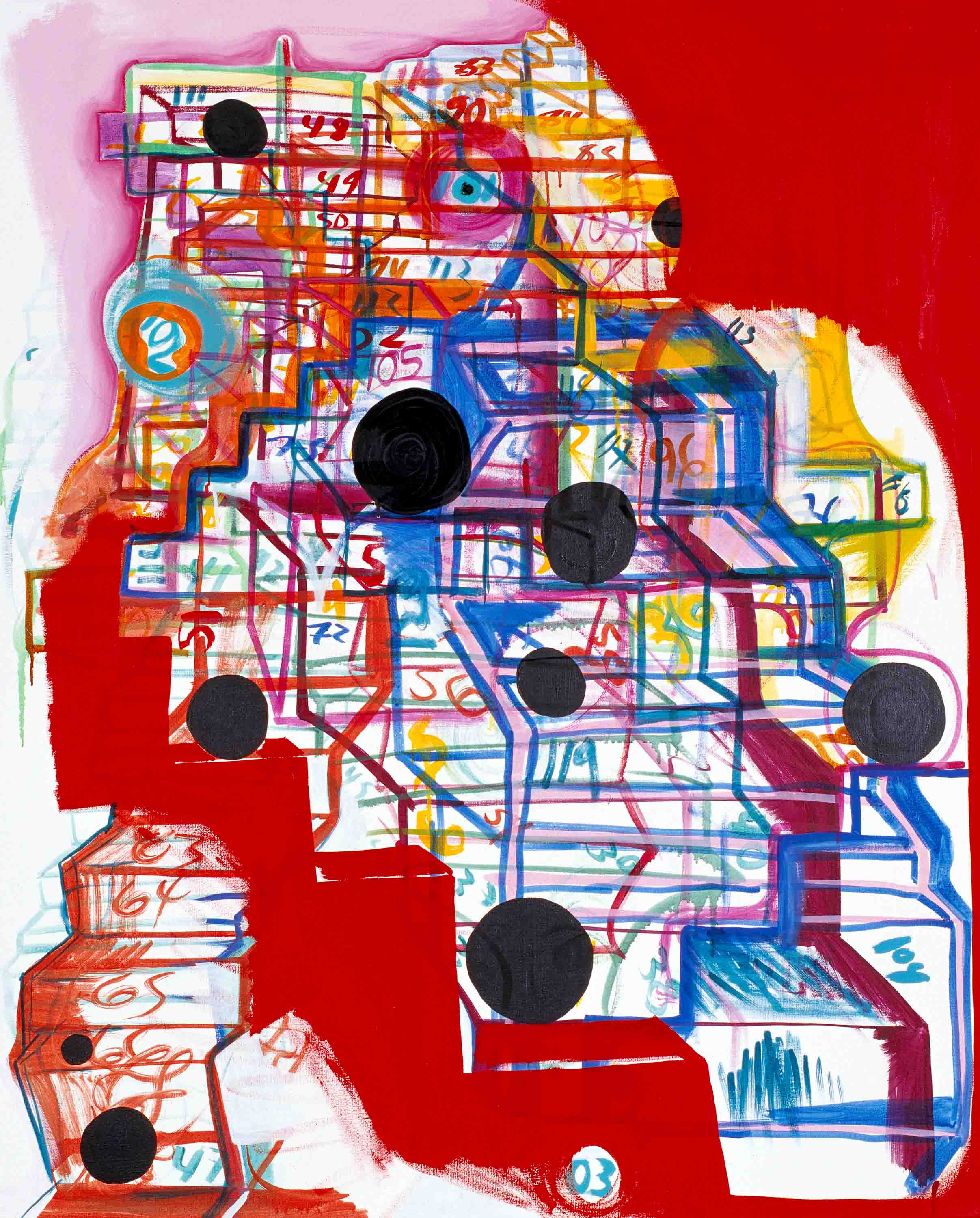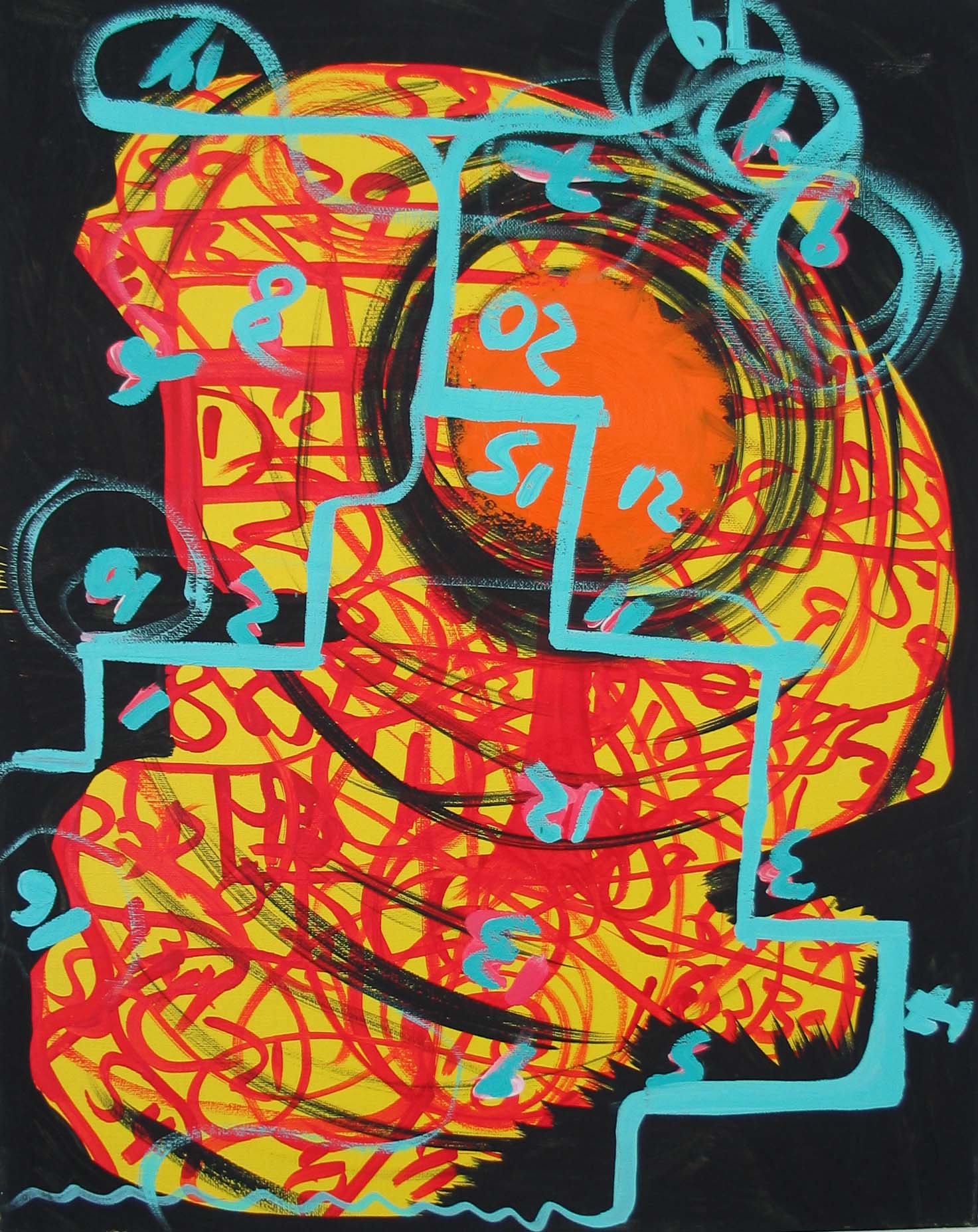 BN: I like that expression: the performance and duration of a painting. When I first wrote about your work back in the late '90s, I spoke about how the paintings perform — as if music or a play was inside each one, and they began to perform when the viewer came into the room. If I think of the paintings you were making at the time, those performances would be alternately whimsical and minimal, very open, with pared down elements linked together in a kind of dance, or suggesting a structure. Now, with process and progression central to your painting practice, if I had to describe the "performance," I would have to say that it's cacophonous, it borders on delirium; in fact, with all of the numerical notations, one of these newer paintings could be seen as the score for an unperformable symphony, a piece of music spun completely out of control. And yet they aren't made that way. You aren't working quickly. Your paintings don't come fast. They are the result of a deliberate, considered approach — the same approach you had in the late '90s. But something changed ...