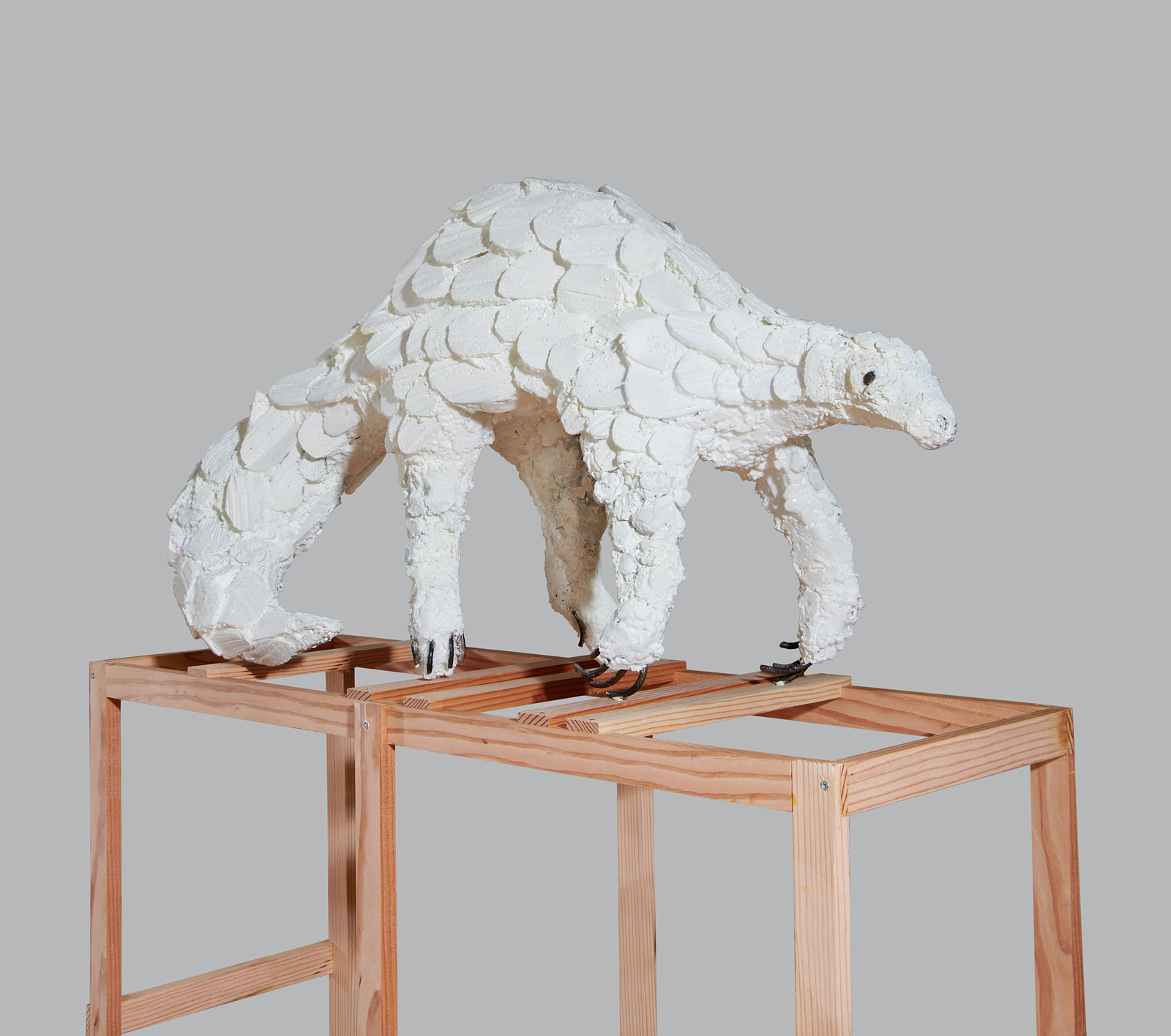 WILLIAMSTOWN -- Pity the poor pangolin, in these desperately troubling times. It might not shoulder quite the blame of its tiny bat cousin for the coronavirus calamity still very much in progress (PSA: WEAR A MASK). But as a harbinger of our current doomsday scenario, its bad PR has gone from miserable to apocalyptic. (Researchers believe the original SARS virus was pangolin-borne.) So what does Lin May Saeed mean to say with her white-as-snow polystyrene pangolin sculpture, poised helpless and forlorn at the Clark Art Institute’s brand-new survey of her work? I don’t know, but it conjured up more sympathy than antipathy from me. If we’d been more broadly inclined to see it (and the bat, of course) as a sensitive creature able to experience fear, love, and pain — rather than, say, lunch — maybe we wouldn’t be in this mess? And I don’t mean this as an indictment of the carnivorous preferences of non-Western cultures; as the main consumer of the 70 billion food animals slaughtered on the planet every year, we in the United States are in no position to judge.