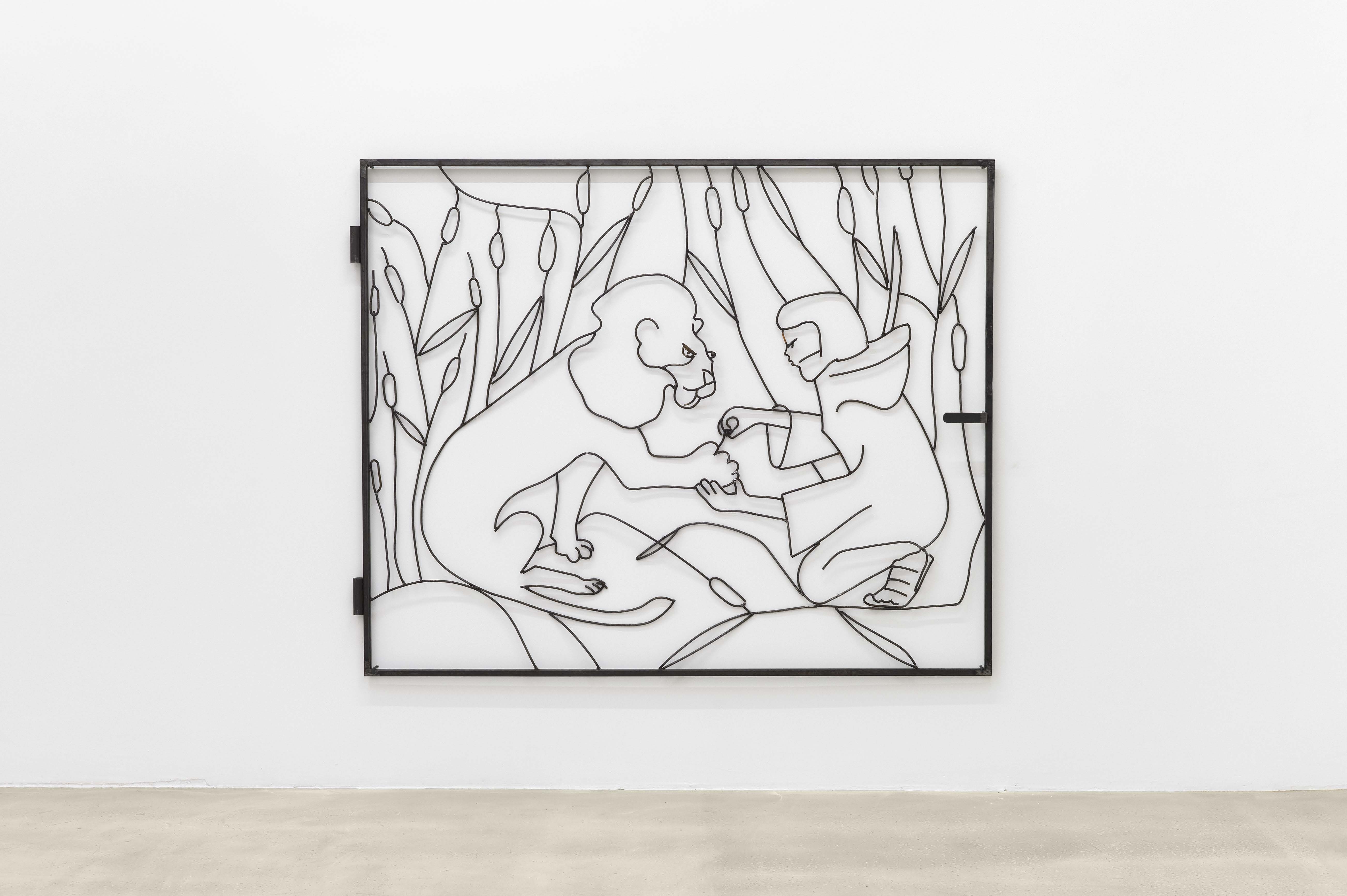 One of the totemic tales that binds Saeed to a larger history is St. Jerome and the Lion, in which the holy man brings about interspecies solidarity by plucking a thorn from the great cat’s paw when it yields its attack, too injured to swallow him whole. (They lived happily ever after, according to early-Christian legend: “(H)e abode ever after as a tame beast with them.”) An earlier piece here captures the story literally as an iron-welded gate (unpredictable, Saeed is; more reason to like her). It’s a slightly hackneyed metaphor, maybe, but the idea of a shopworn tale becoming a portal waiting to swing open to a different kind of interspecies engagement fits the artist’s gently endearing agenda. Her work is about possibility, not condemnation, the hope that a balance can be reset.