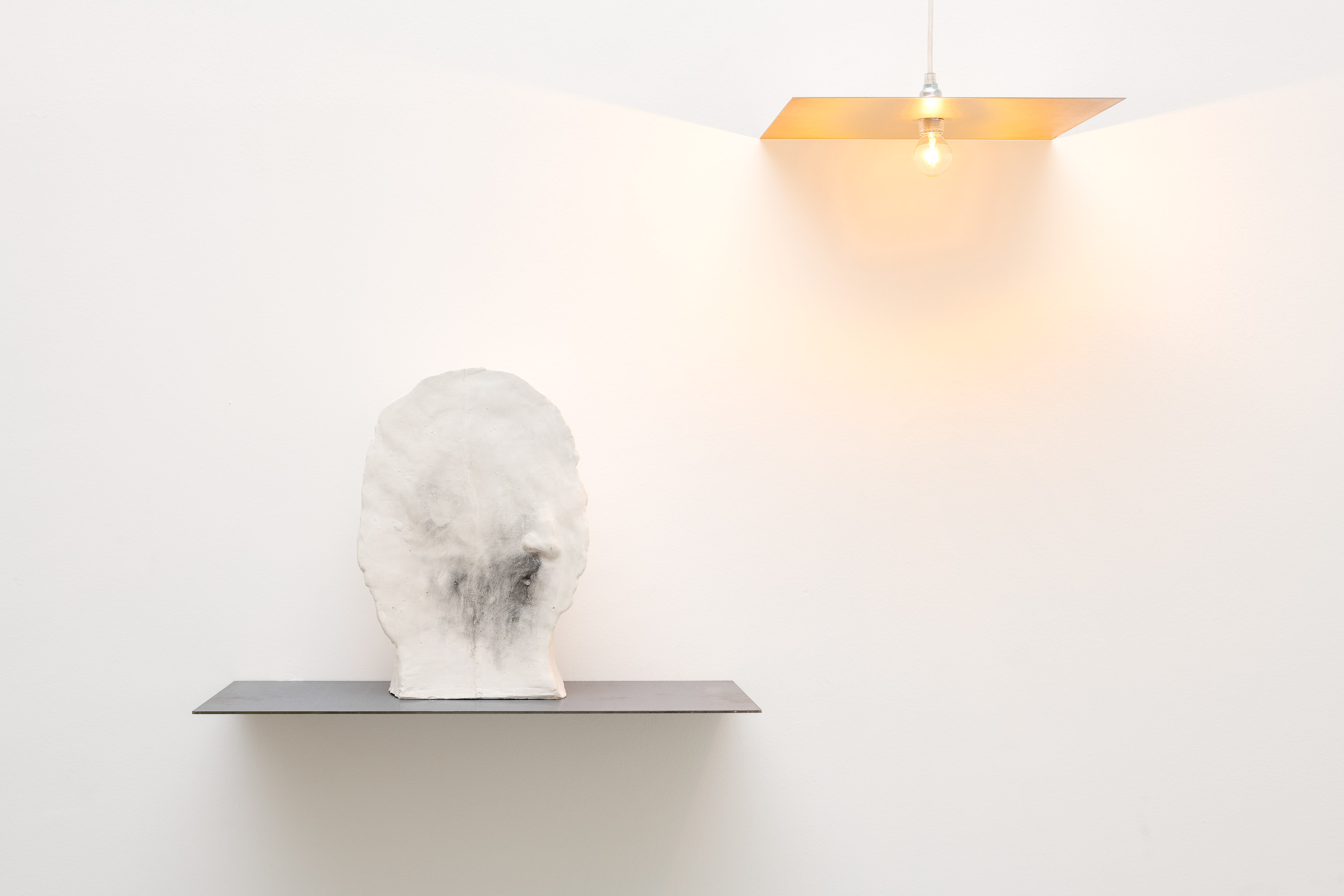 A light hangs alongside three plaster heads. The small bulb and its feeble light create the space of an interior. An interior from some time ago. The slender iron surface that acts as a lamp is both a light and a ceiling, part of a frame closed at the bottom by a shelf that is the continuation of the surface. It is a space created through the sections and slippage of the same iron blade. The head, placed between those two cuts, calls to mind the painted sculptures during the Metaphysical period, cramped into rooms with very low ceilings that can barely hold them, spaces that are too intimate to host the marble sculptures of heroes.