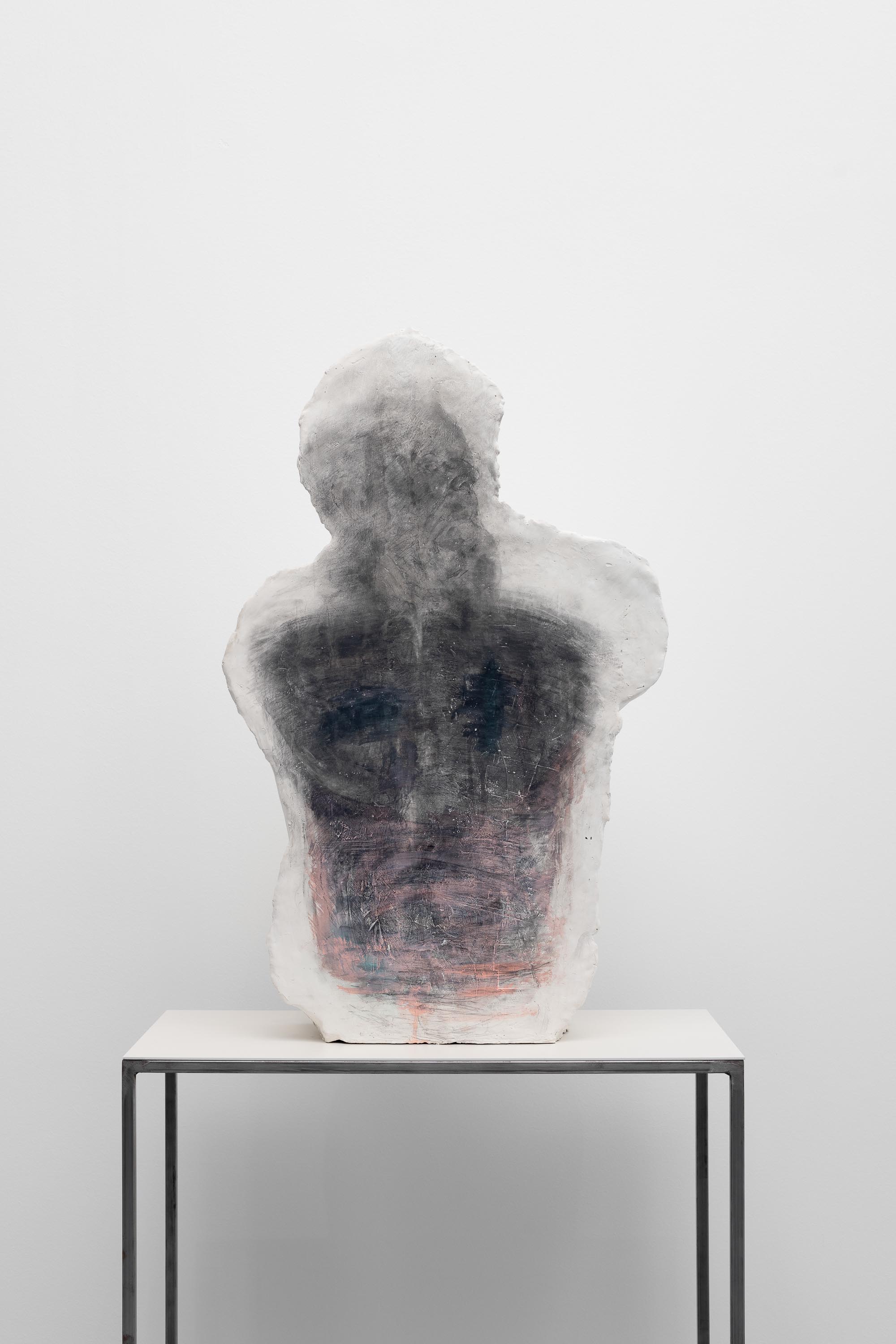L’uso del metallo, le linee assottigliate, le gambe fini come stiletti dei suoi ultimi basamenti stretti attorno al volume della scultura, appartengono a un tempo molto diverso, opposto al primordio dei gessi. Il loro è un tempo del dopo, un tempo clinico, post-operatorio. Disegnano sotto le sculture spazi ristretti, ritagliati, in pieno contrasto con le vastità remote da cui provengono le sculture. Il bianco liscio, quasi lucido dei piani di ferro verniciati, non sembra poter toccare il bianco farinoso del gesso. Tra l’uno e l’altro cade una sottile linea d’ombra, come se due bianchi così diversi per temperatura emotiva non potessero davvero condividere lo stesso spazio e la stessa ora.