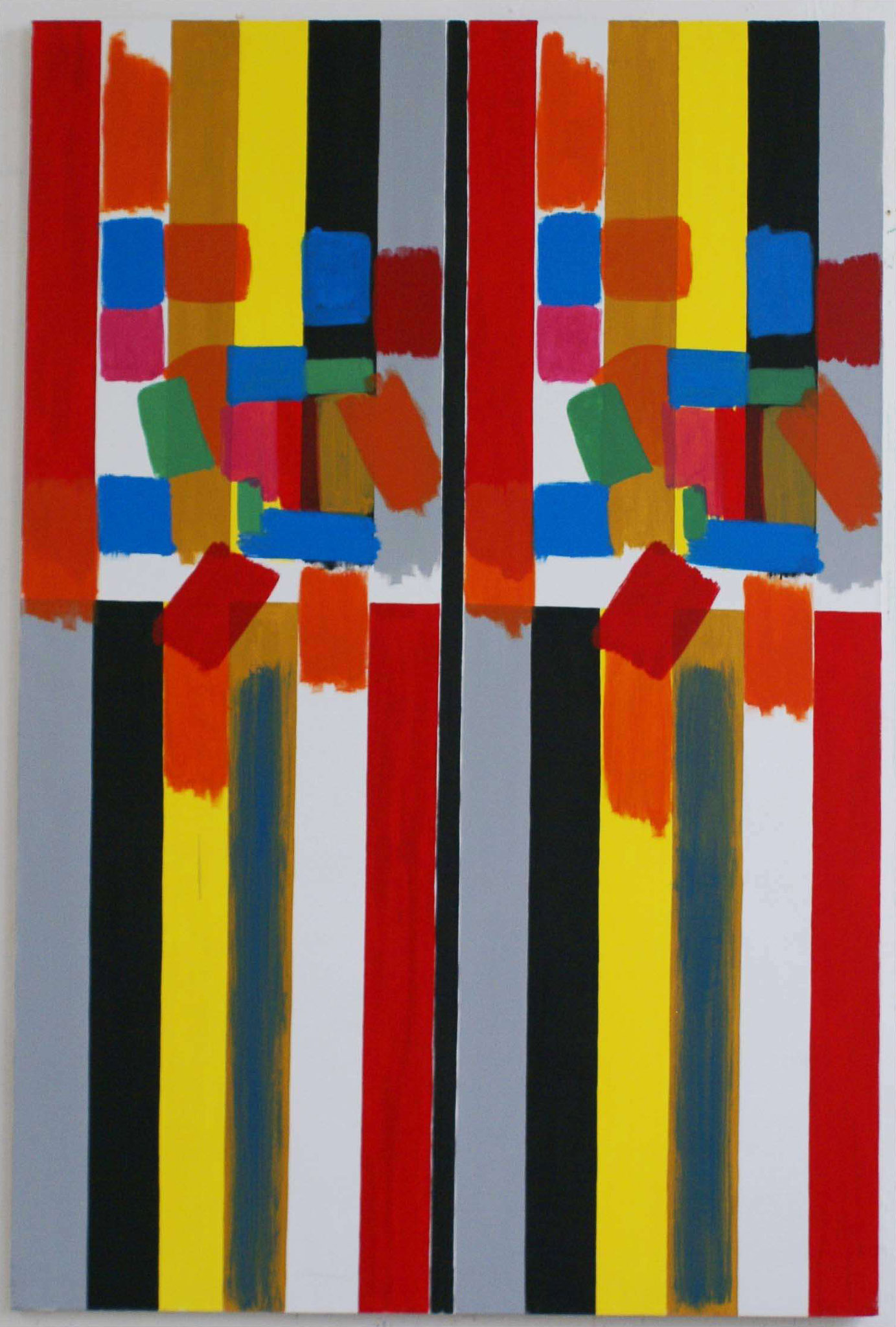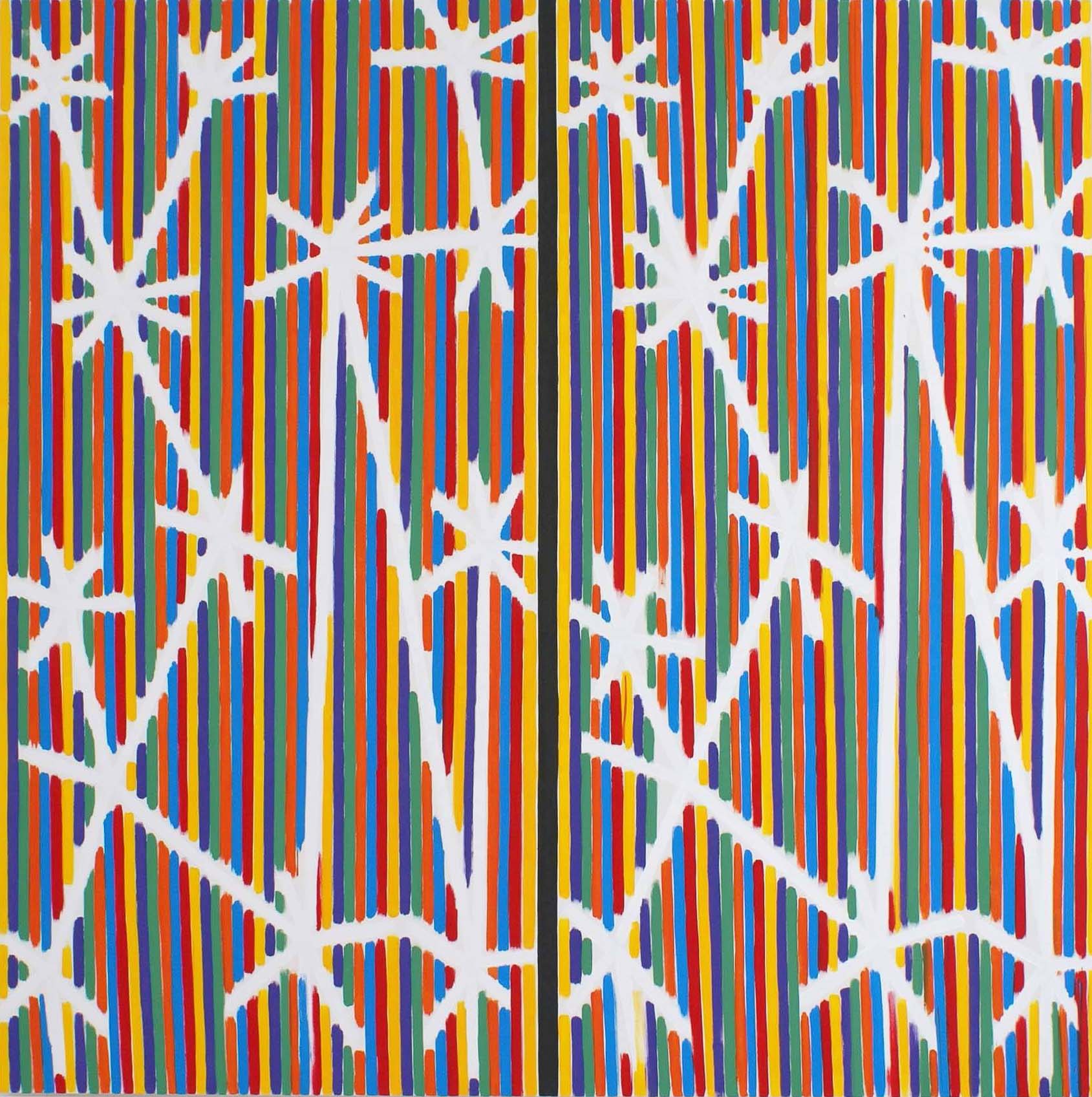 French artist Bernard Piffaretti bases his practice on repetition while analysing the components of painting. After art studies at the school of Fine Arts in Saint-Etienne from 1973 to 1979, he began to elaborate his “Piffaretti system”, fixed in 1986. This protocol is at the origin of every work he produces: each is composed of two panels apparently identical, separated by a vertical strip; one of the two parts is an attempt to duplicate the other, made beforehand. Once both panels are finished, the distinction between the copy and the original tends to fade. As the artist admits himself, “the repetition, act by act, on the second half of the canvas, can only produce an imperfect image”: Piffaretti's system aims at showing us this impossible reproduction of the artistic gesture. In some works, the second part is even left irremediably blank, because of the complexity of the shapes painted. Piffaretti also realizes Drawings after paintings, reversing the concept of preparatory sketches and using them to seize his own work.