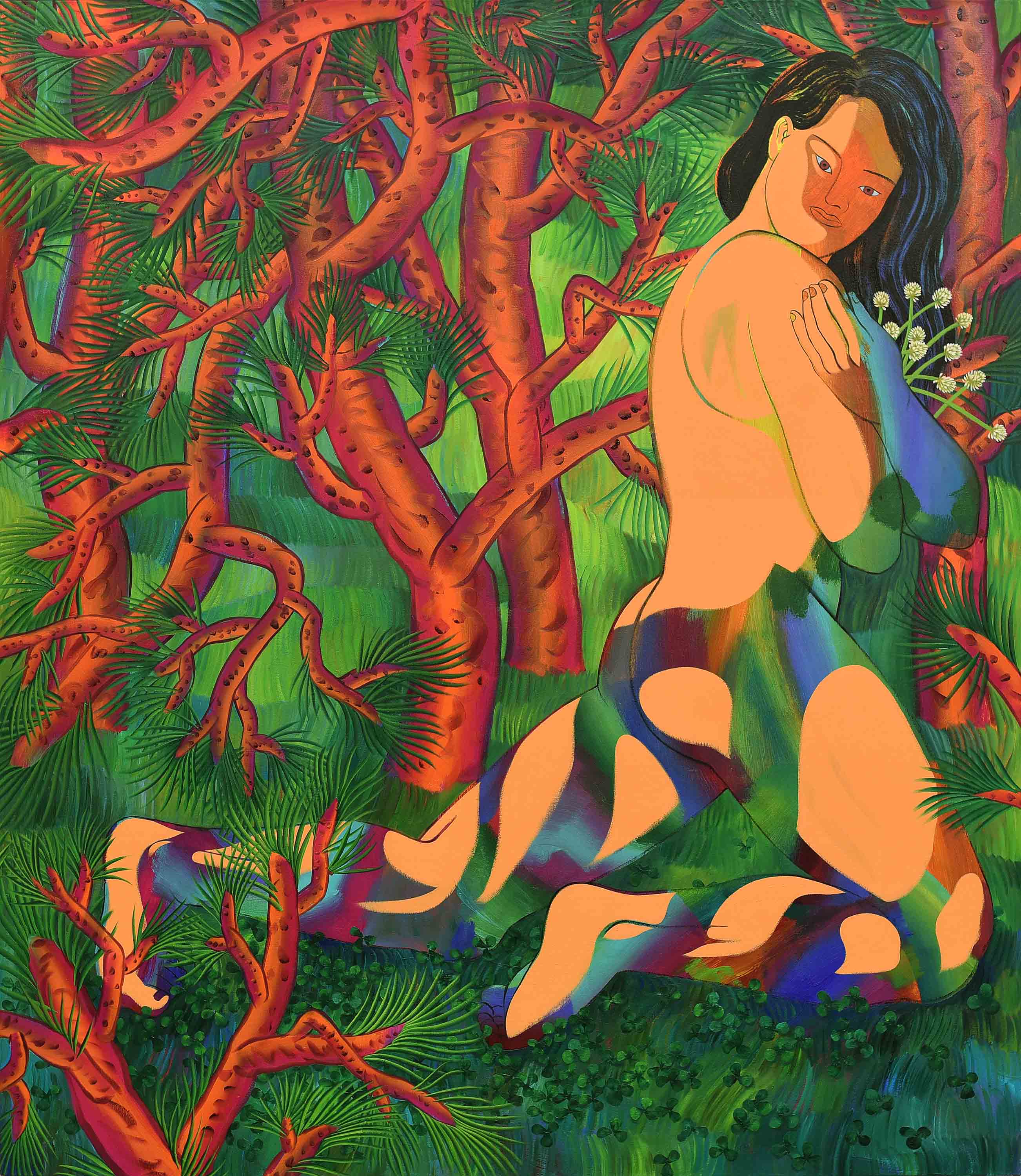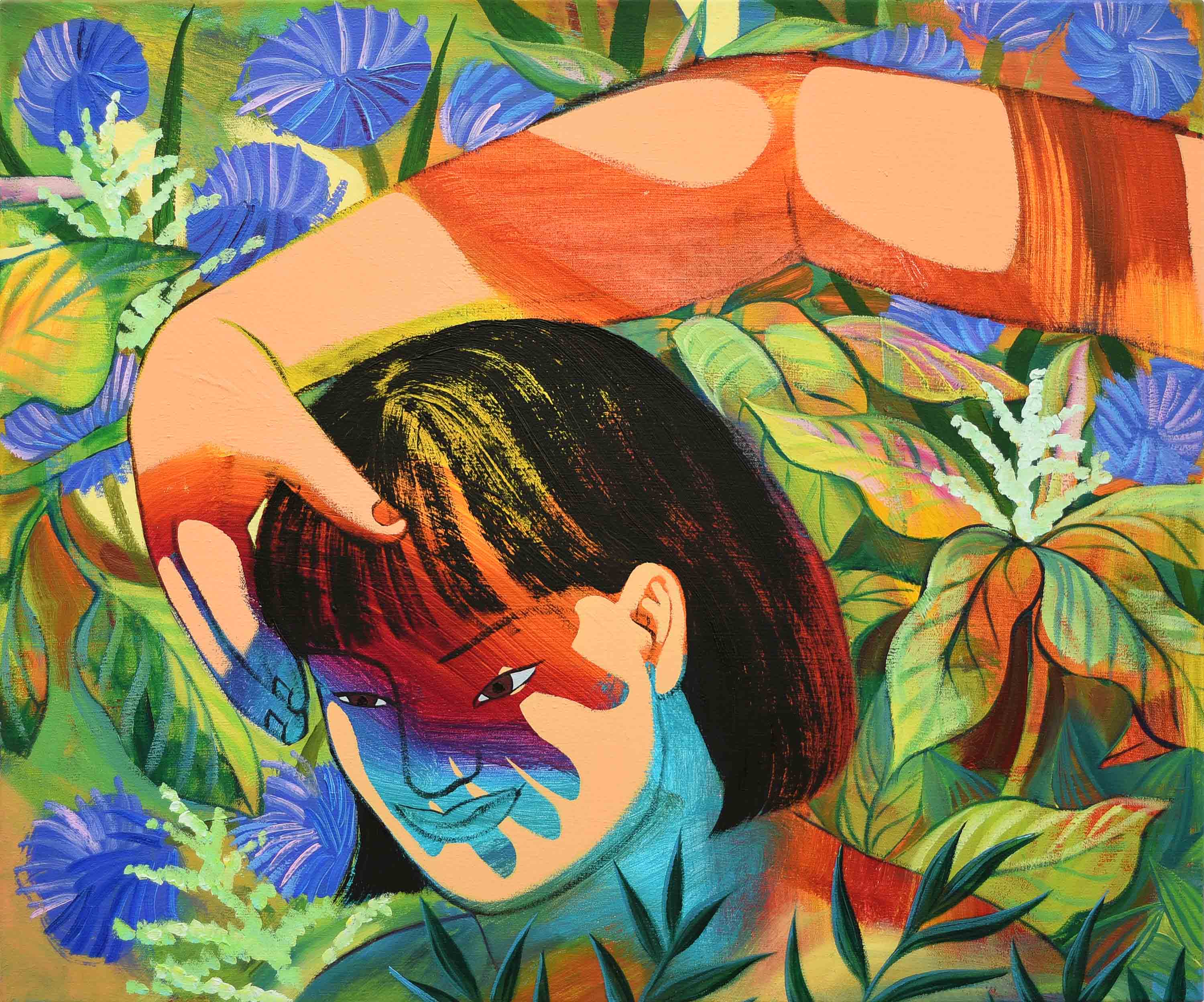 In the ceaseless time of looking at Kim’s oeuvre, it is hard to escape from her figurative yet abstractly gazing human beings. In order to emancipate herself from the historical discourse of figurative expressionism, Kim’s artistic language has developed from the visual imagination of abstract figures. It combines figurative realisation of uncovered yet demonstrative bodies with abstractly sketched components from her understanding of human beings with unfinished narratives. Her appreciation of human beings forms its own artistic semiotics, such as the combination of human bodies with natural patterns or fragments from the abstract backgrounds of each painting.